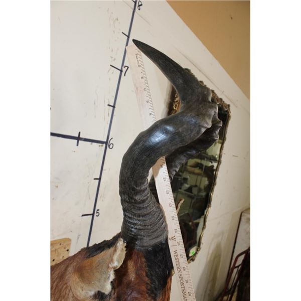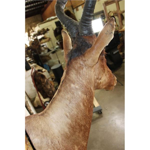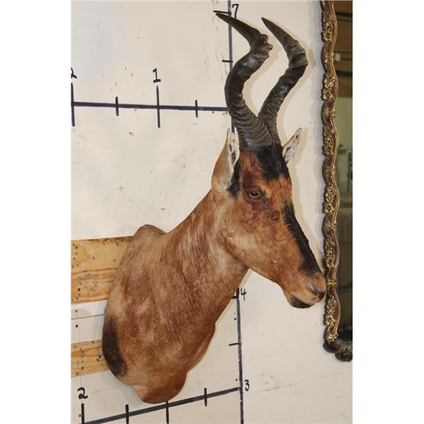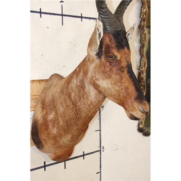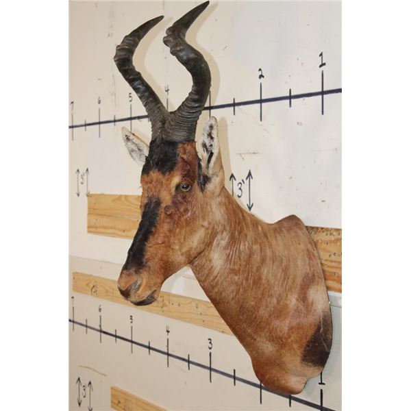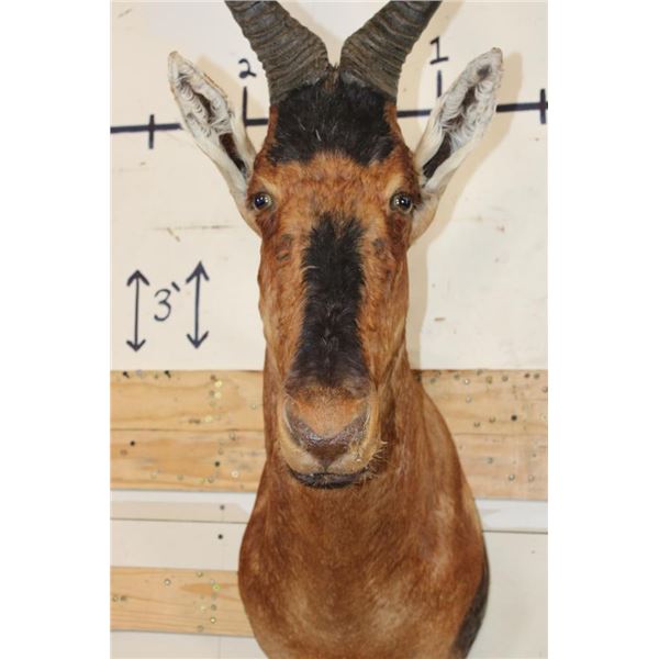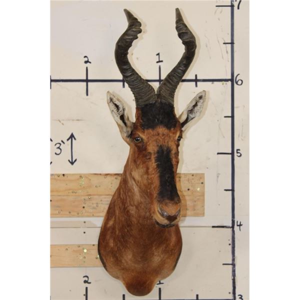 RED HARTEBEEST Shoulder Mount. The Left Horn measures 20" Long and the Right Horn measures 20 5/8" Long. It has some minor left ear damage, but otherwise it is in Good Condition. TAXIDERMY