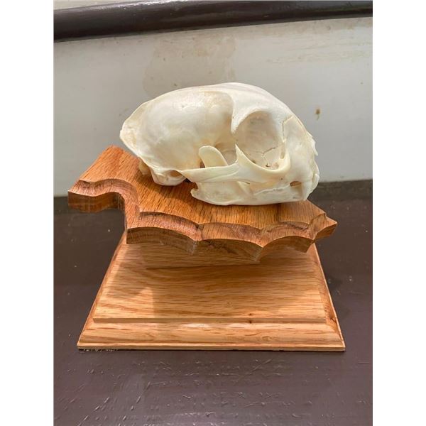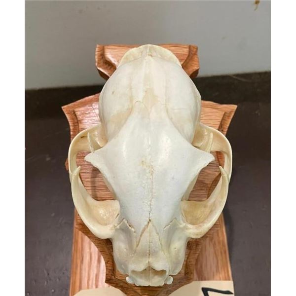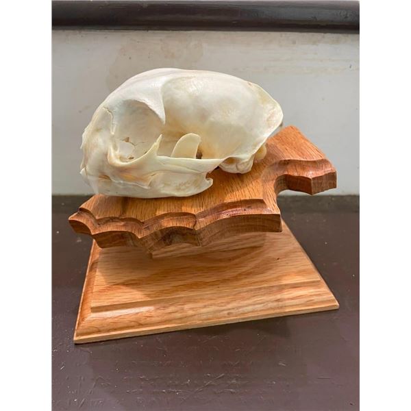 XL ALASKAN LYNX Skull with All its Teeth. It is mounted on an Oak Wood Pedestal Display that measures 7" Long x 5" Wide. ODDITIES AND CURIOSITIES TAXIDERMY