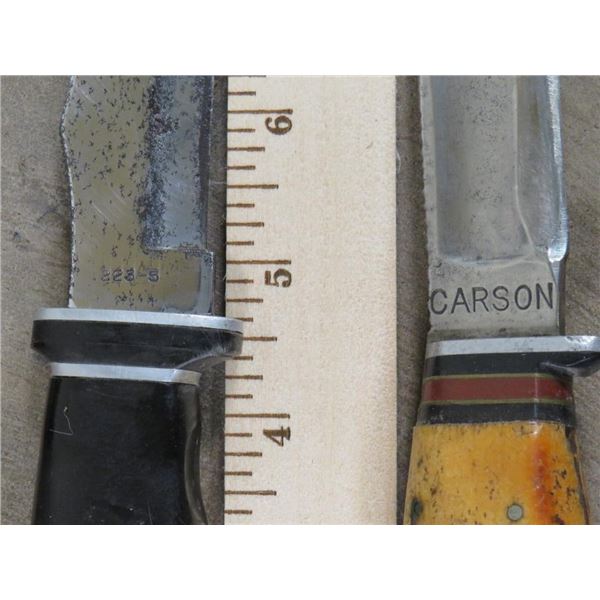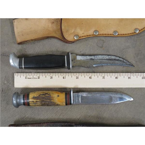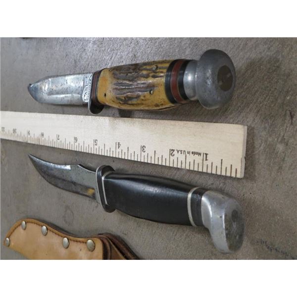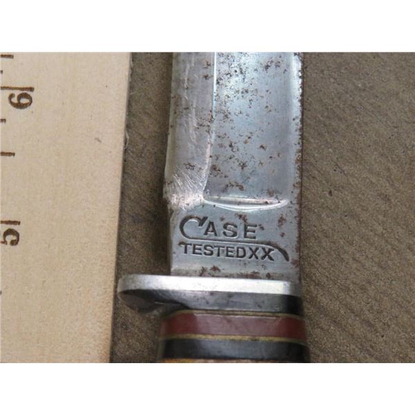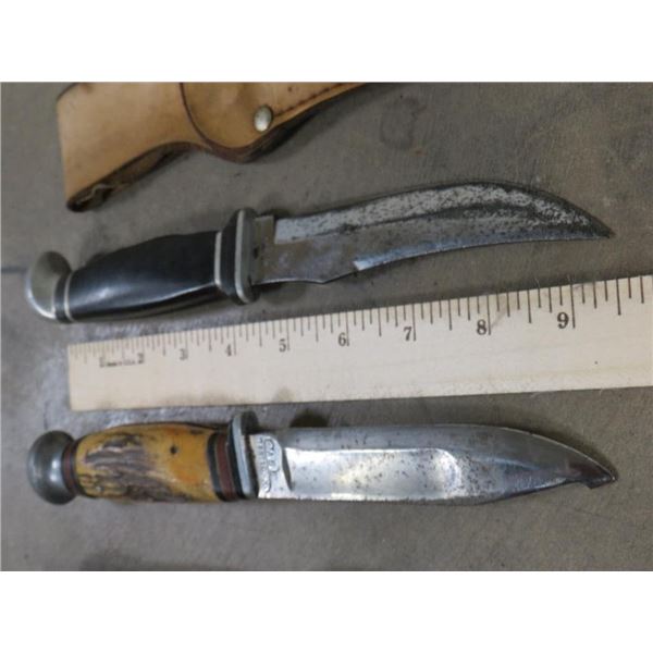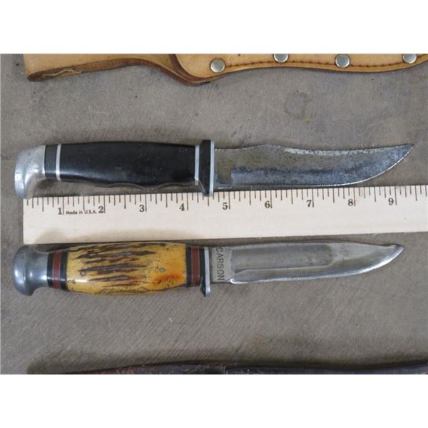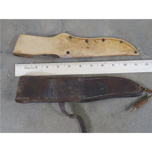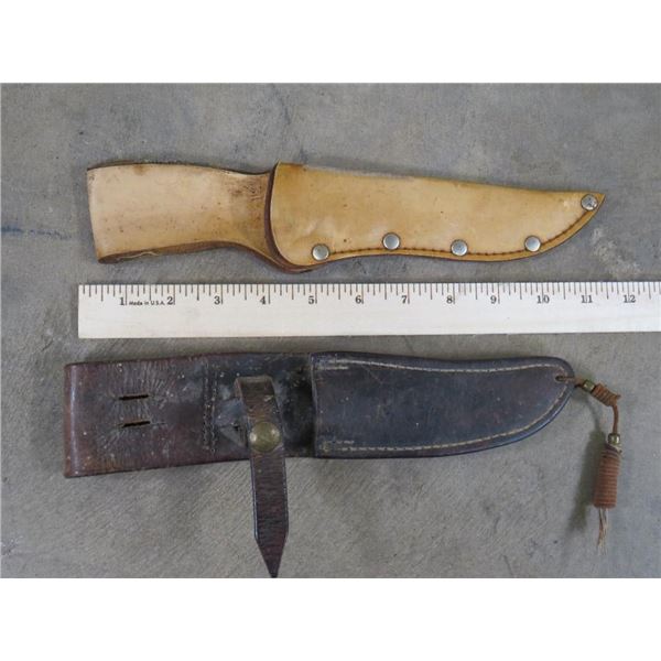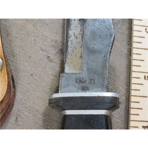 2 Vintage KNIVES with Leather Sheaths by "CASE TESTED XX". Made in the USA. One price for both. Measure: 9 1/8"Long and 9 5/8"Long (ONE$). VINTAGE KNIVES BLADES TOOLS