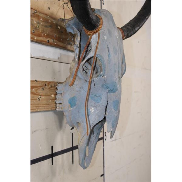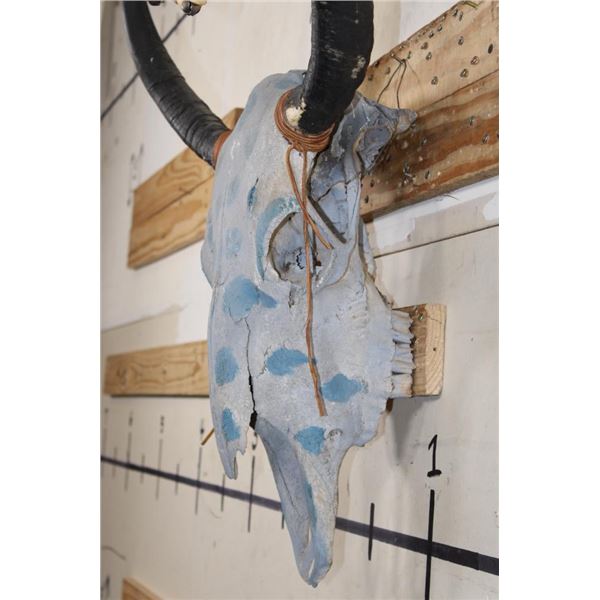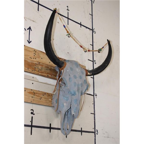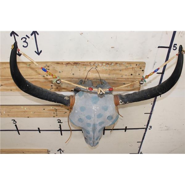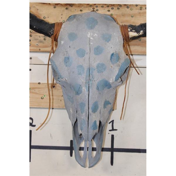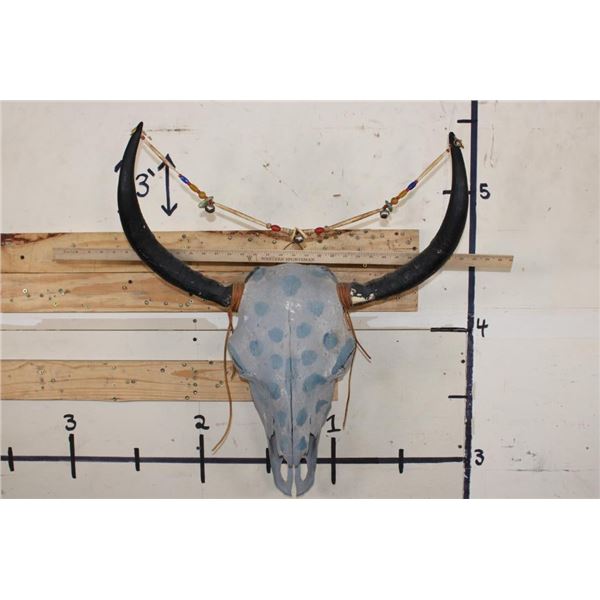 Decorative YAK Skull painted with blue polka dots and adorned with beads. It has a heavy duty wall hanger. DECORATIVE TAXIDERMY