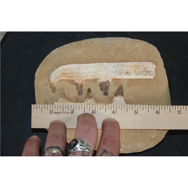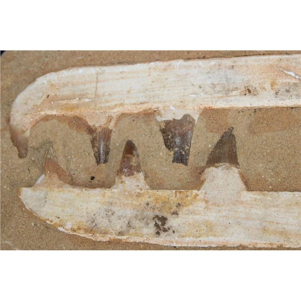 5 Authentic MOSASAUR TEETH Fossils in a Reproduction Jaw and Rock Matrix. It measures 7" Long x 6" Wide x 1.75" Thick and Weighs: 2 lbs 14 oz. Mosasaur teeth fossils are from the Late Cretaceous Period are are approximately 70 Million Years Old. ROCKS FOSSILS MINERALS