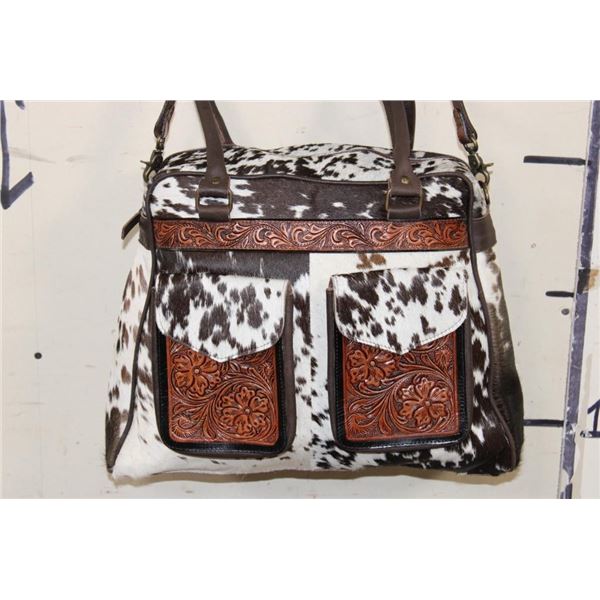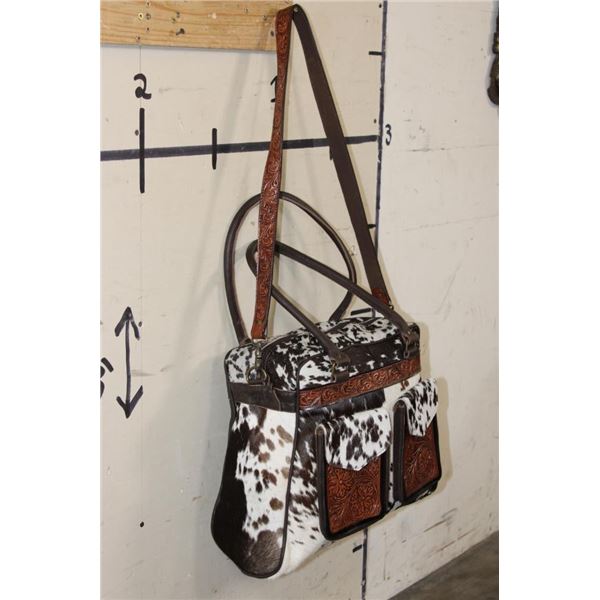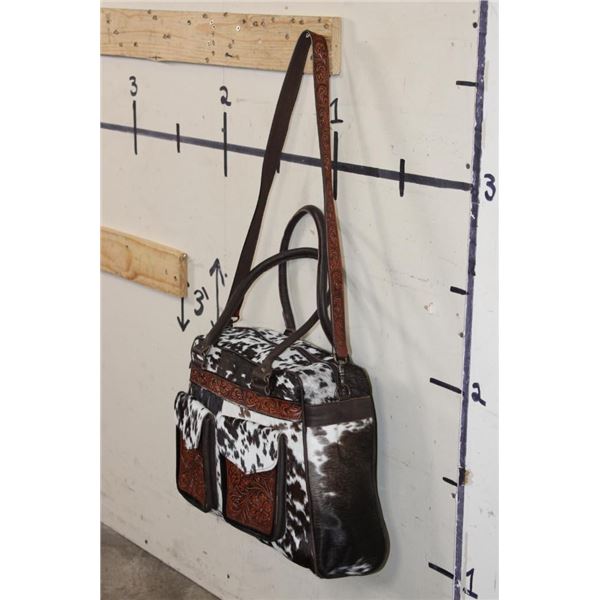 Beautiful *Brand New* Salt and Pepper COW HIDE Leather Bag with tooled details. It measures 17" Long x 7" Wide x 13" Tall and has a removable carrying strap. You can carry this as a purse or use it as a work bag. WESTERN BAGS AND PURSES