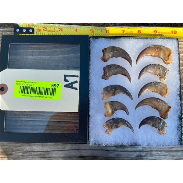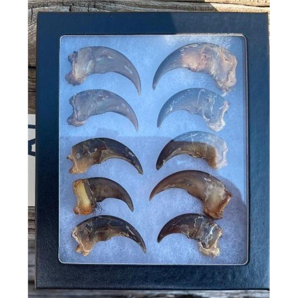10 BLACK BEAR Front Claws in a Glass Display Case. The Glass Case measures 6.25" Long x 5.25" Wide. Great for Native American crafts! These could be used for necklace pendants or added to belt buckles with resin. (ONE$) TAXIDERMY
