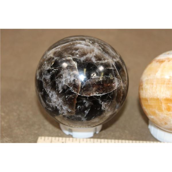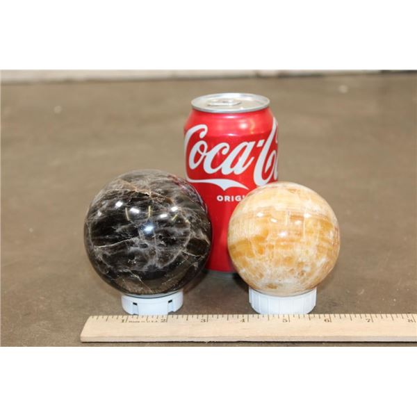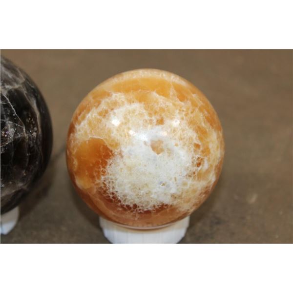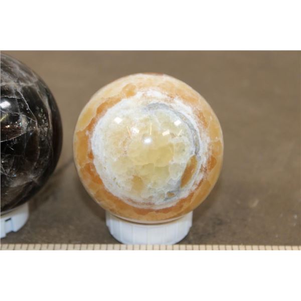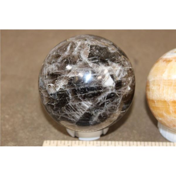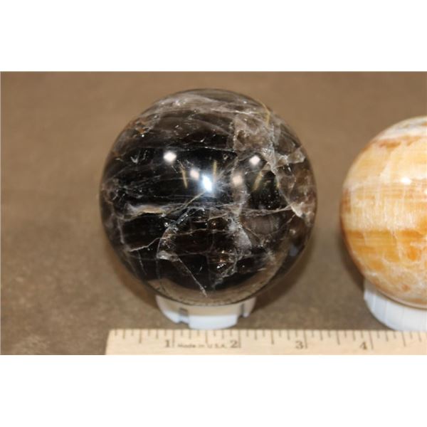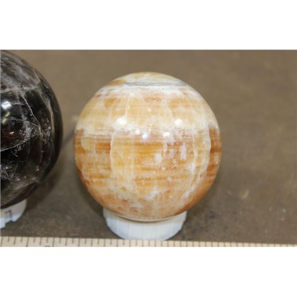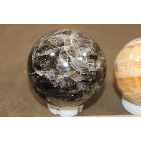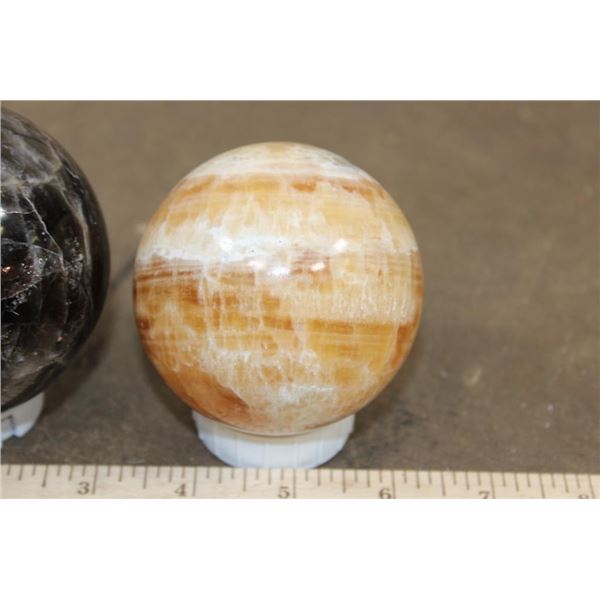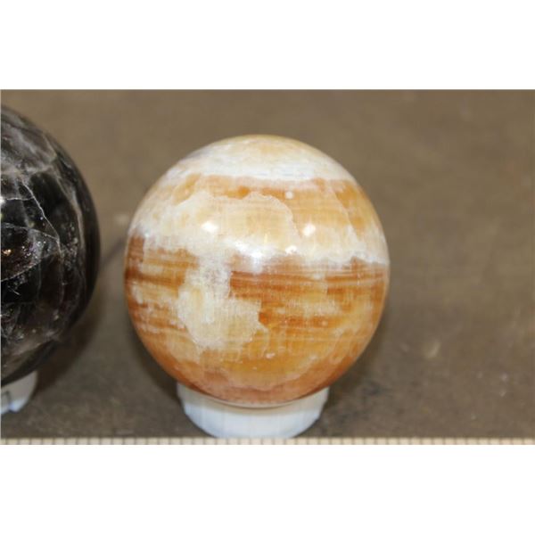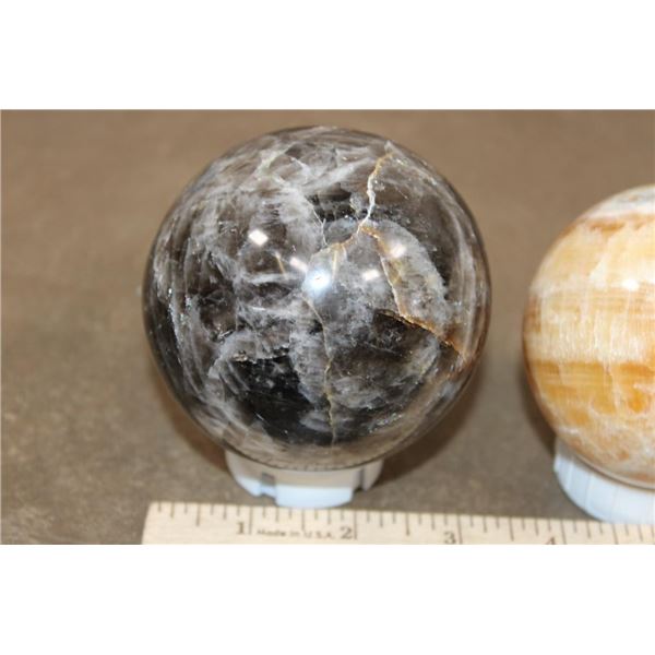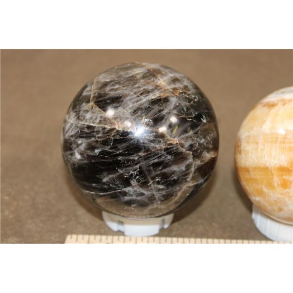 2 Mineral Spheres. Pictured left is the BLACK MOONSTONE Mineral Sphere. It measures 3 3/8" in Diameter and Weighs 1 lb 13 oz. Pictured right is the Banded ORANGE CALCITE Mineral Sphere. It measures 3" in Diameter and Weighs 1 lb 3 oz. Black Moonstone is associated with protection from mental and psychological harm, as well as enhancing intuition and inner knowing. Banded Orange Calcite is a stone of endurance, charisma, and sexual energy. (ONE$) ROCKS MINERALS FOSSILS SPHERES