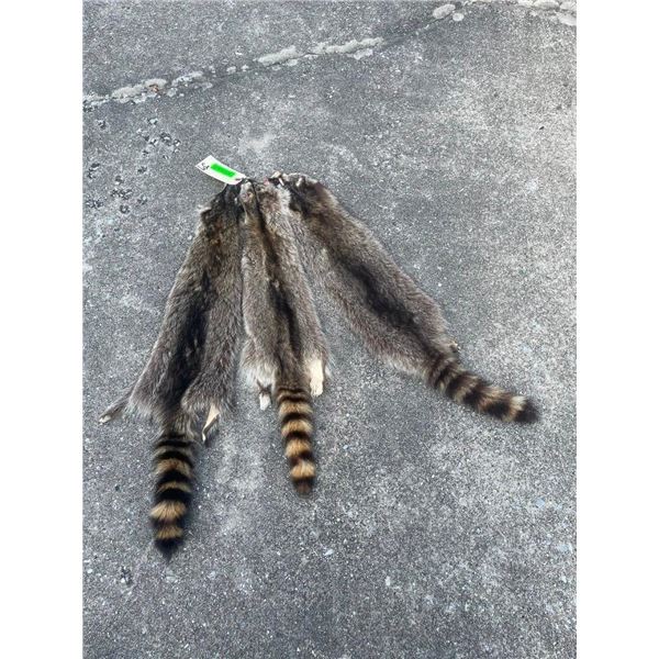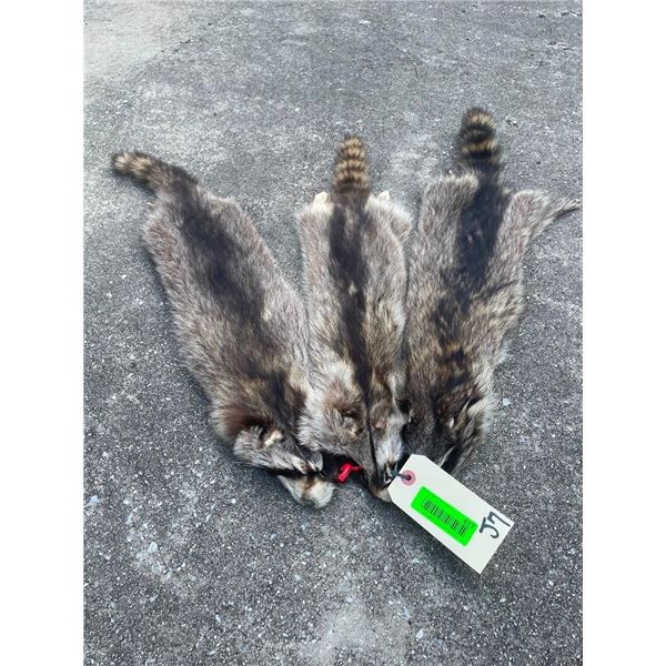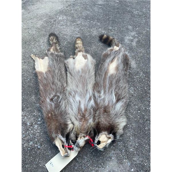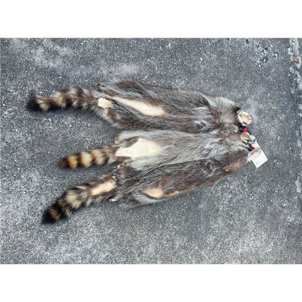 3 *New* Large Soft and Tanned RACCOON Furs or Hides. They measure 36", 35", and 32" Long. Great taxidermy decor for a hunting lodge or log cabin. (ONE$) TAXIDERMY HIDES