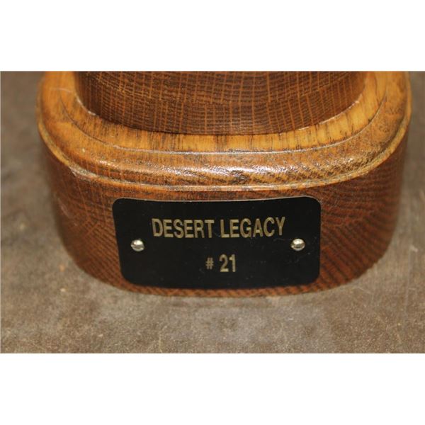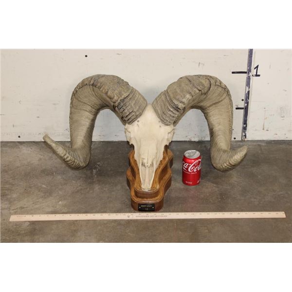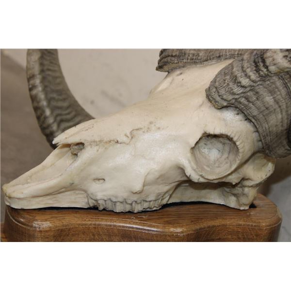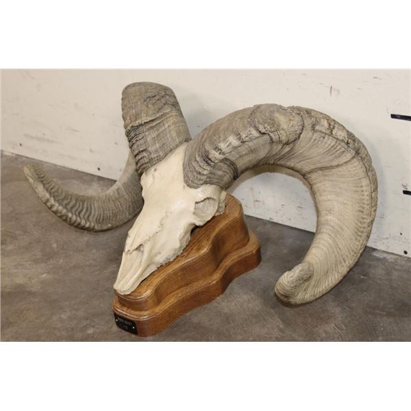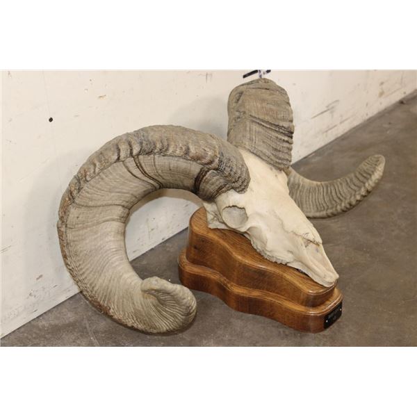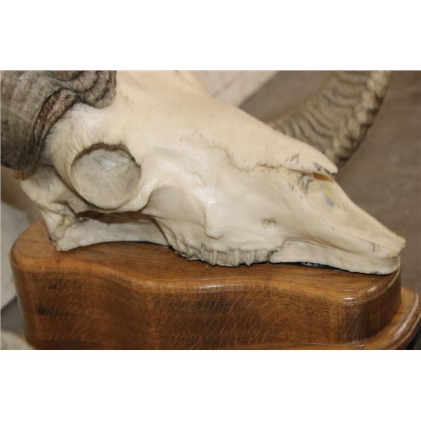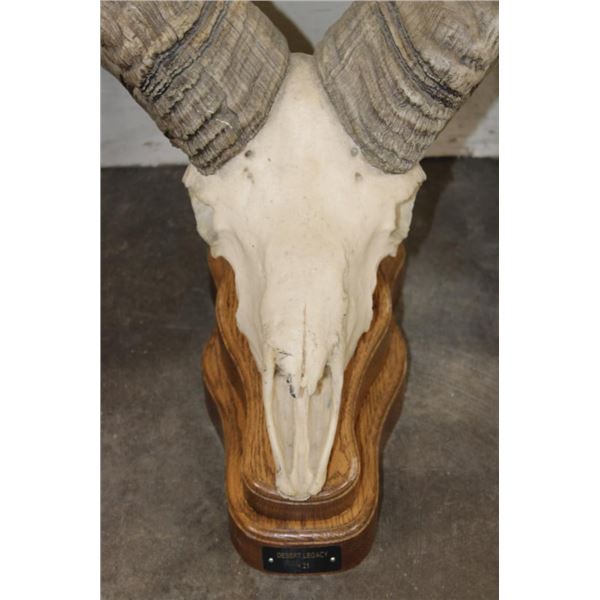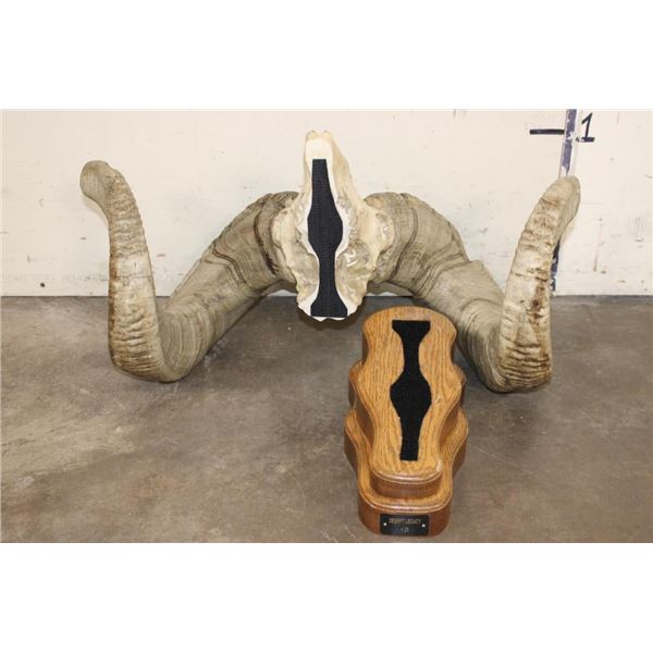 Massive Reproduction DESERT SHEEP Skull and Horns on a Wood Table Pedestal. It is attached with velcro and is removable. The Right Horn measures 41" Long and 15" around the Horn Base. The Left Horn measures 40" Long and 15" around the Horn Base. TAXIDERMY