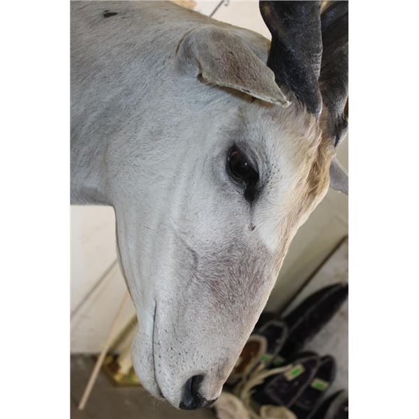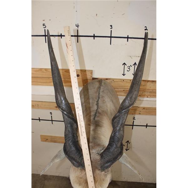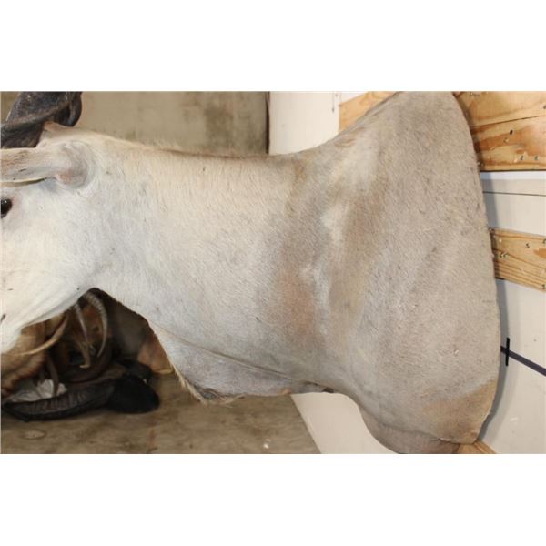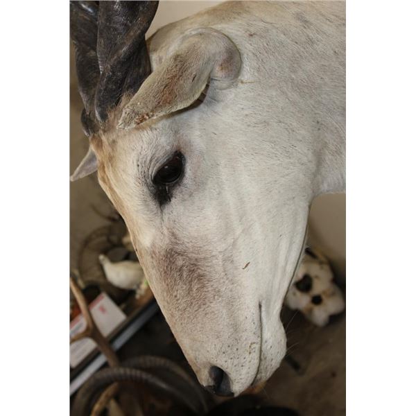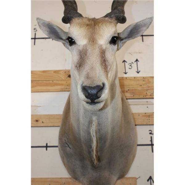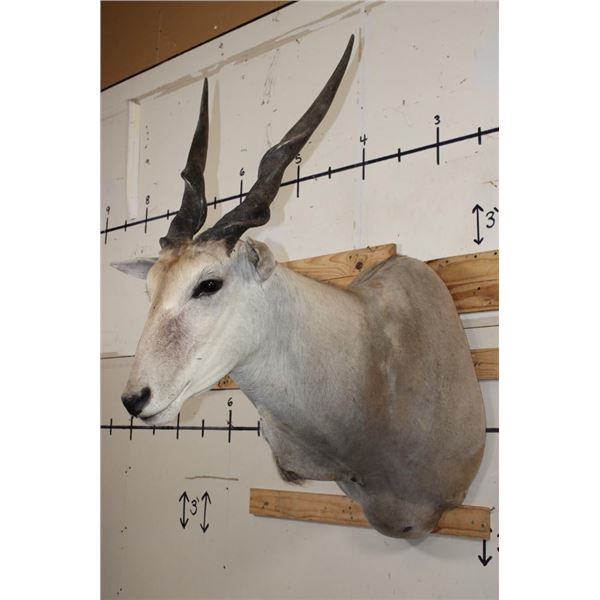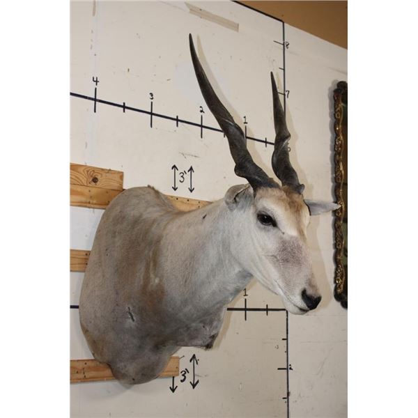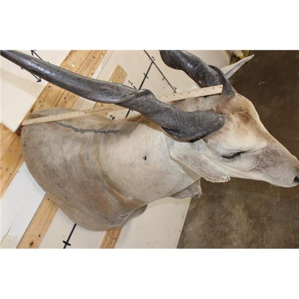 ELAND Shoulder Mount. The Left Horn measures 31.75" Long and the Right Horn measures 32" Long. It is in Good Condition. TAXIDERMY