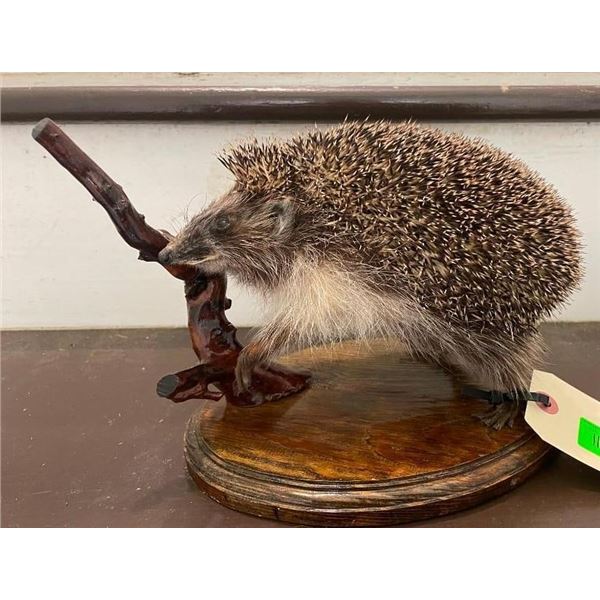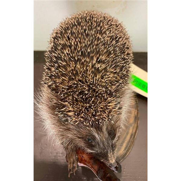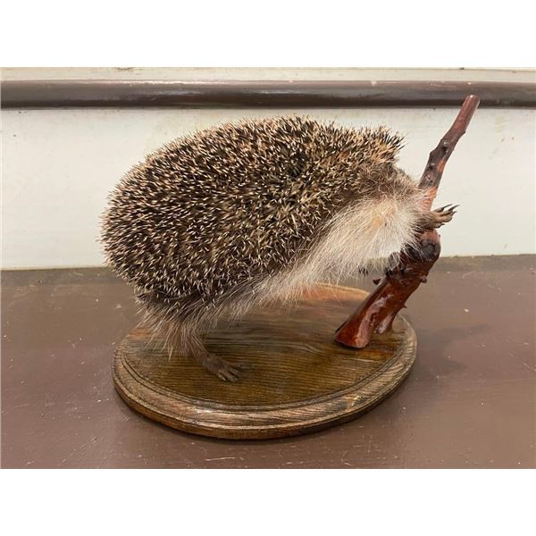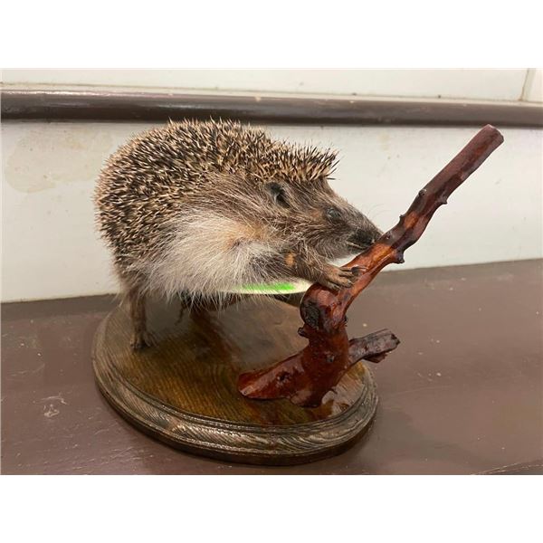 *Rarely Seen* Life-sized EUROPEAN HEDGEHOG. He is mounted on a Wooden Circular Base with his little paws perched onto a stick. The mount measures 9.5" Long x 7" Wide x 8" Tall. This is a very nice and rare piece, attention collectors! ODDITIES AND CURIOSITIES TAXIDERMY