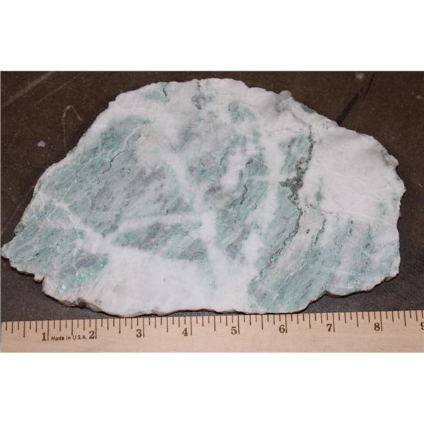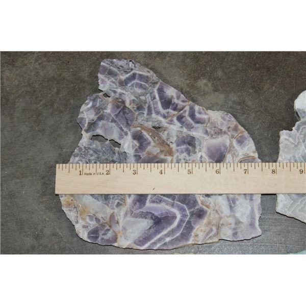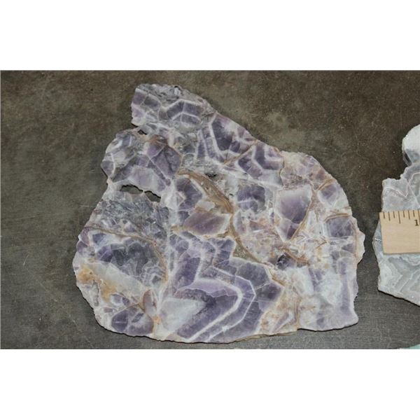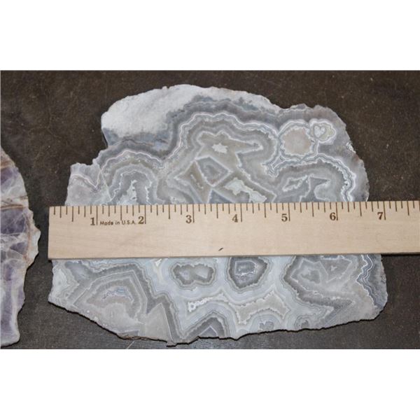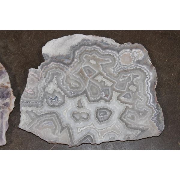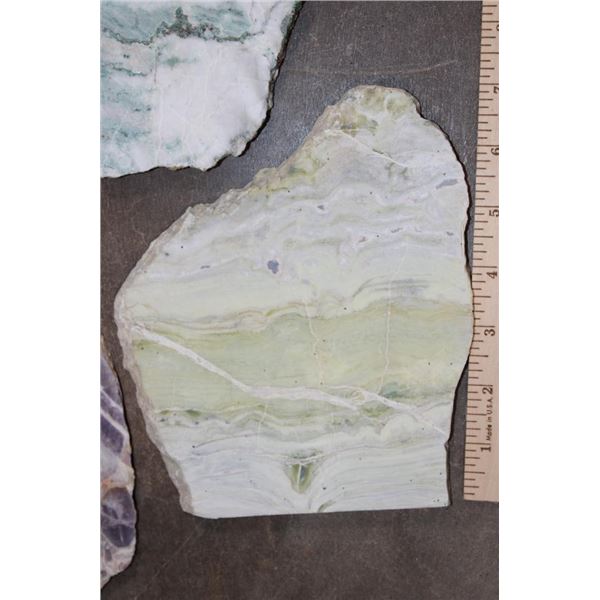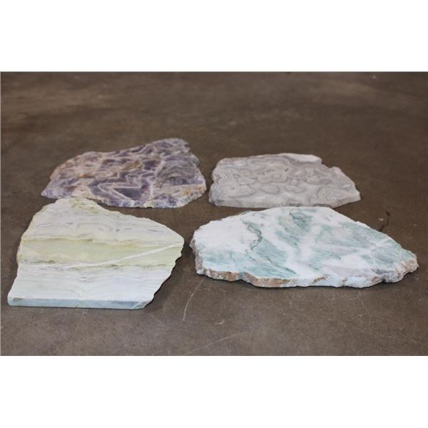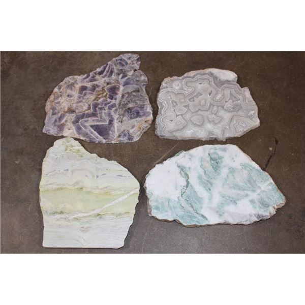 4 Mineral Slices that measure 1/4" Thick (each). 1 DREAM AMETHYST, 1 CRAZY LACE AGATE, 1 JADE GREEN ONYX, and 1 GREEN TREE AGATE. The Total Weight is 4 lbs 8 oz. (ONE$) ROCKS FOSSILS MINERALS