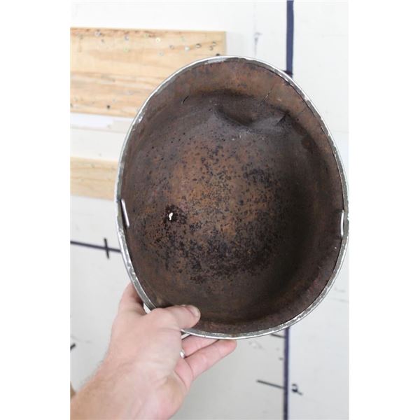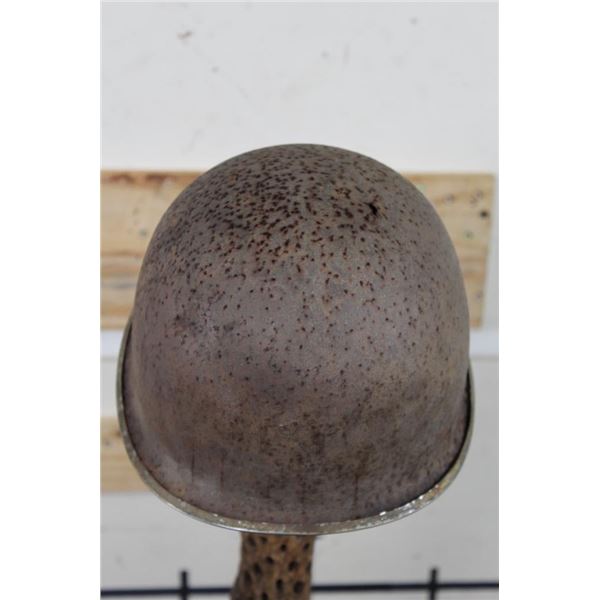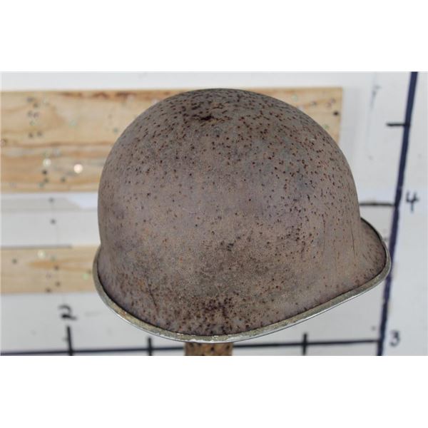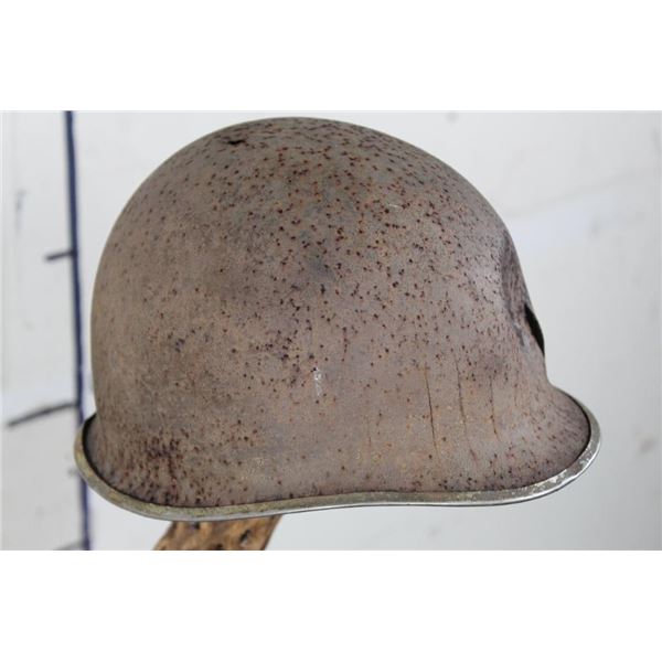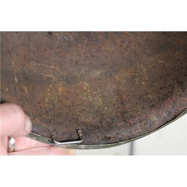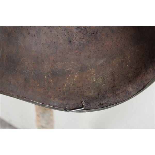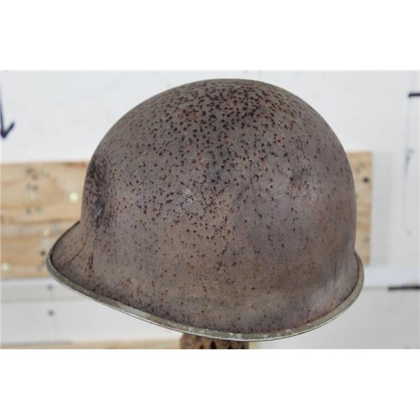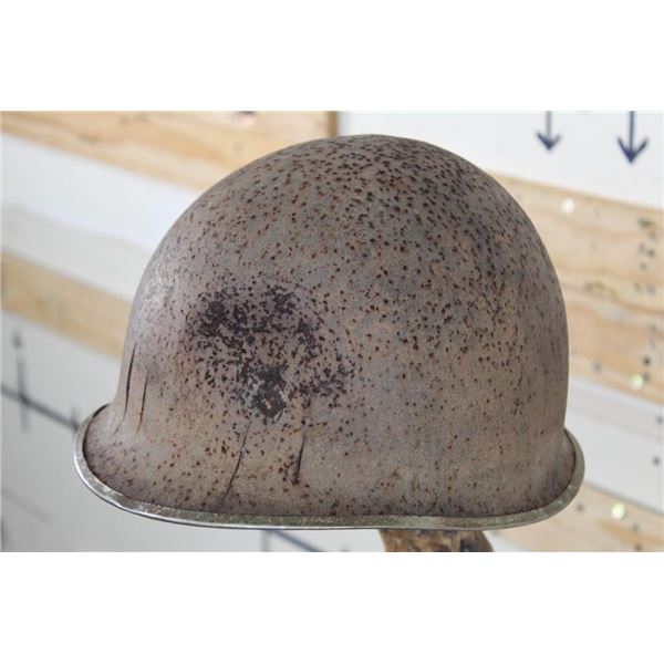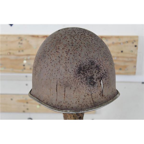 Original (Early) WW2 Fixed Bale U.S. M1 Steel Combat Helmet Shell. There is a BIG "758" hand painted on inside, possibly from the 758th tank battalion. It has battle or combat damage on the front. COLLECTIBLE WWII MILITARIA