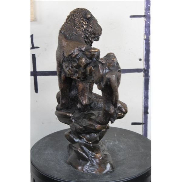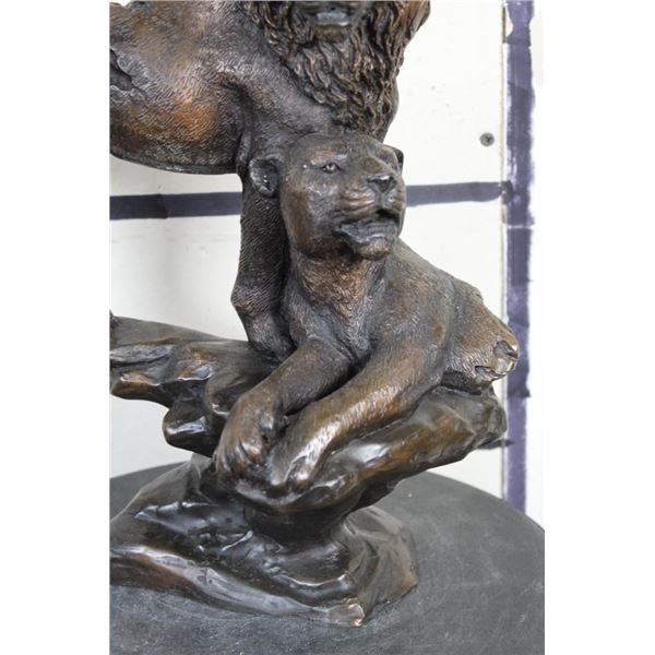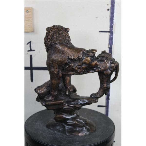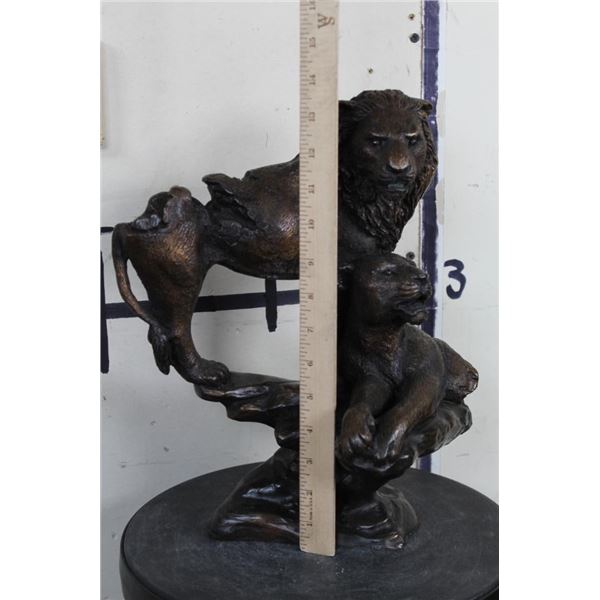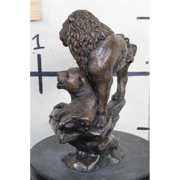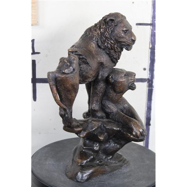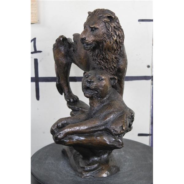 BRONZE LION and LIONESS Sculpture. It measures 14" Tall x 11.5" Wide x 7" Depth and the Total Weight is 14lbs 13oz. COLLECTIBLE ART BRONZE SCULPTURES
