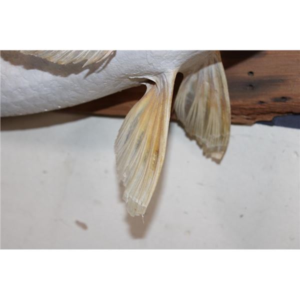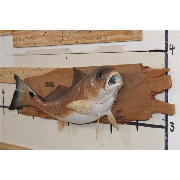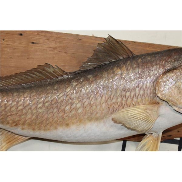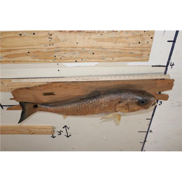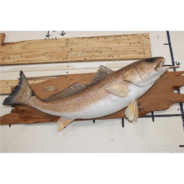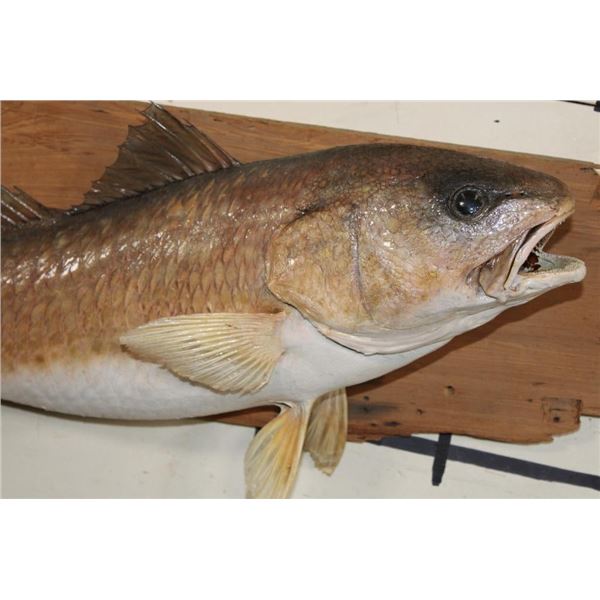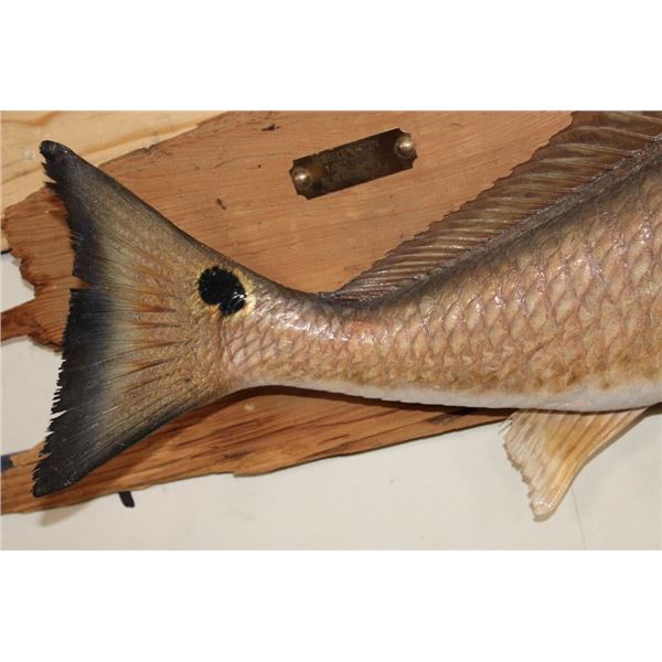Beautiful *Real Skin* RED FISH mounted on a Piece of Wood Plank. It measures 36" Long and has a metal plaque that states "Russell Snoddy Taxidermist New Iberia, LA". This is a lovely Fish mount that would be great nautical decoration. DECORATIVE NAUTICAL TAXIDERMY FISH