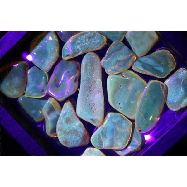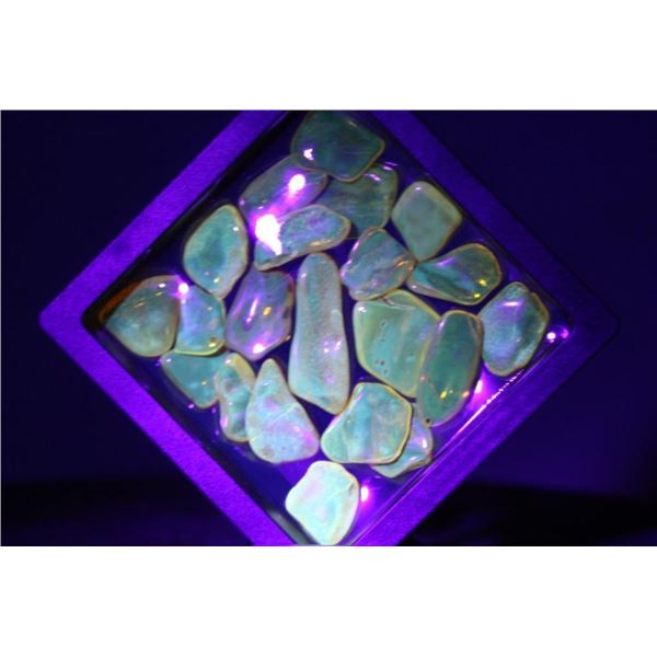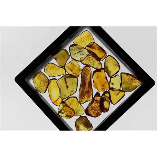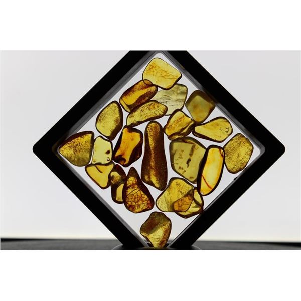 20 Pieces of Authentic "Baltic Gold" AMBER Fossil Gemstones. The Total Weight is 18.73 g. They have been UV Tested and are Reactive. Baltic Amber or "Baltic Gold" is fossilized tree resin that originated from ancient coniferous forests in the Baltic Sea region around 44 to 54 million years ago. These Specimens would be perfect for jewelry making. (ONE$) ROCKS MINERALS FOSSILS(ONE$)