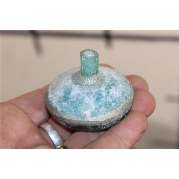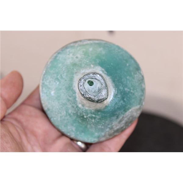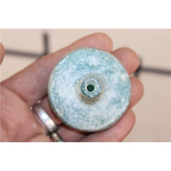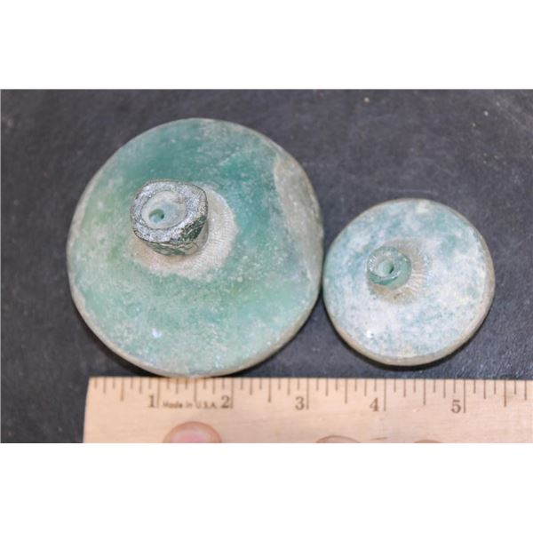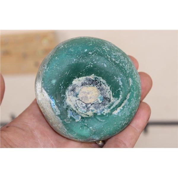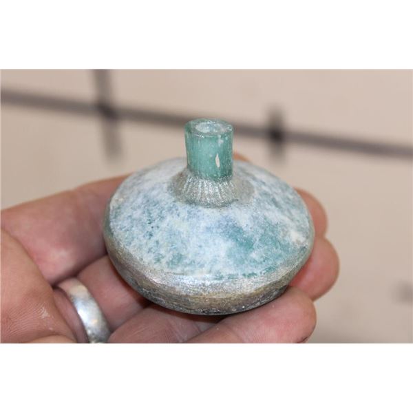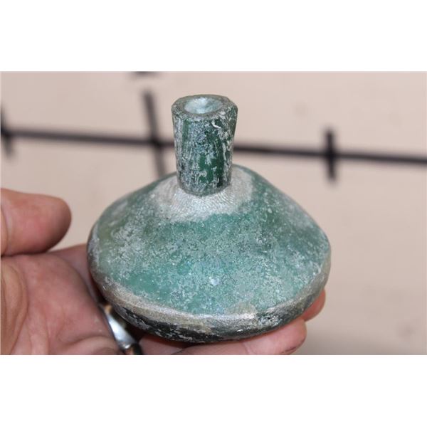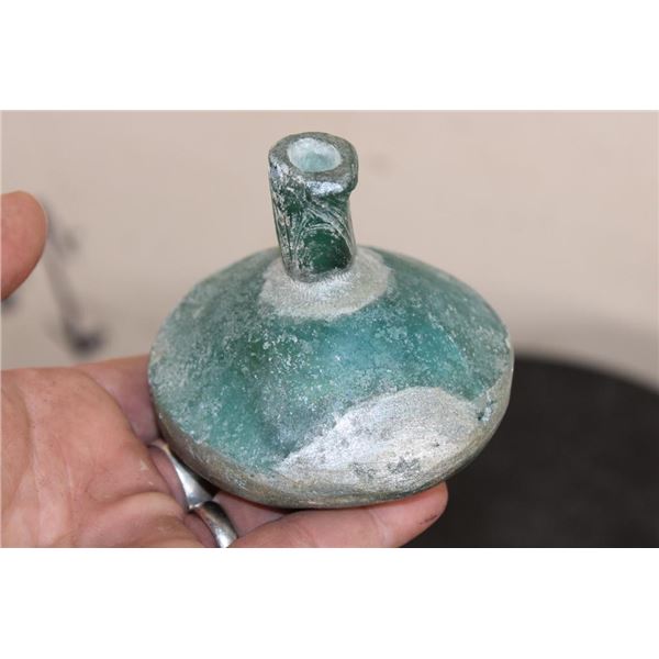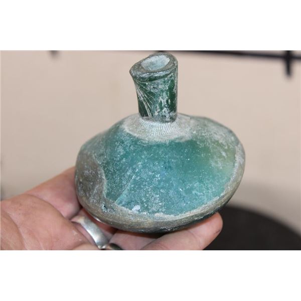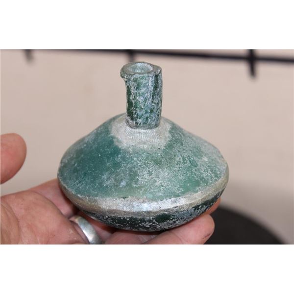 2 Beautiful Ancient Roman Glass Bottles. The larger bottle measure 3 3/8" in diameter x 3.25" Tall and weighs 10 oz. The smaller bottle measures 1.75" Tall x 2.25" in Diameter and weighs 80.93 g. Roman glass dates back around 2,000 years, originating during the time of the Roman Empire. The production of glass in the Roman era significantly advanced with the invention of glassblowing around 50 BC. This innovation made glass more accessible and allowed for a wider variety of shapes and designs. (ONE$) ANCIENT ARTIFACTS