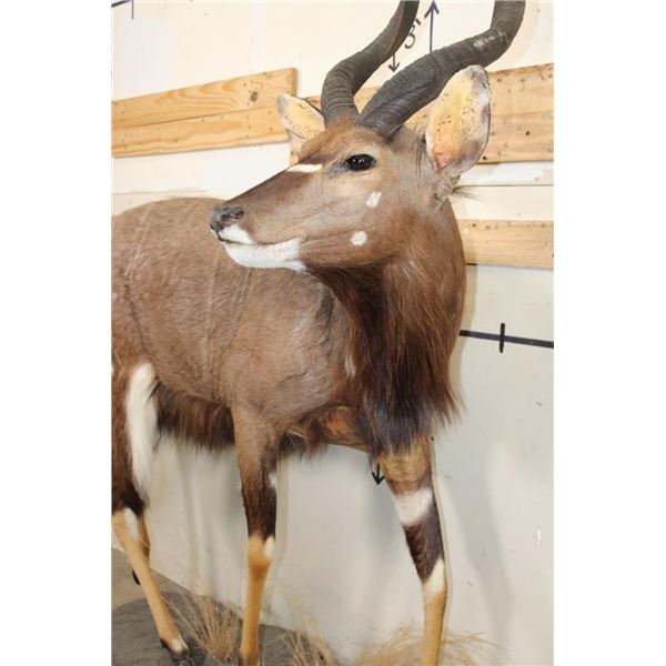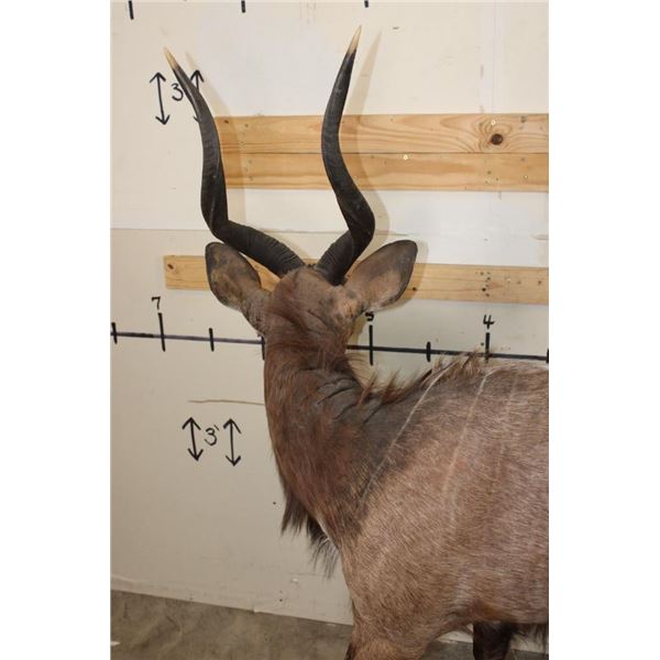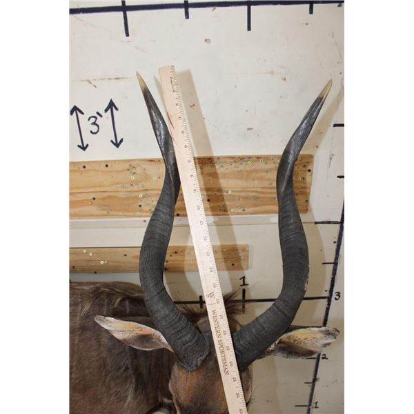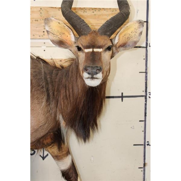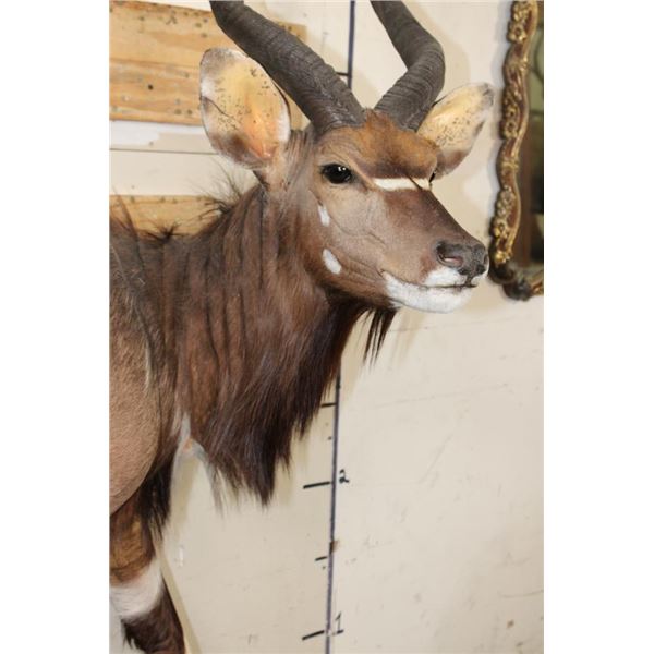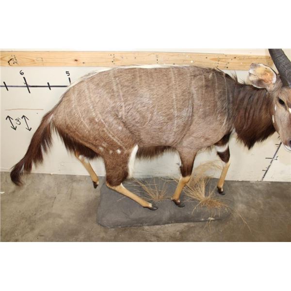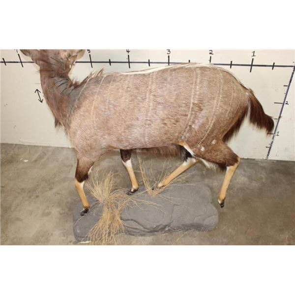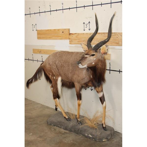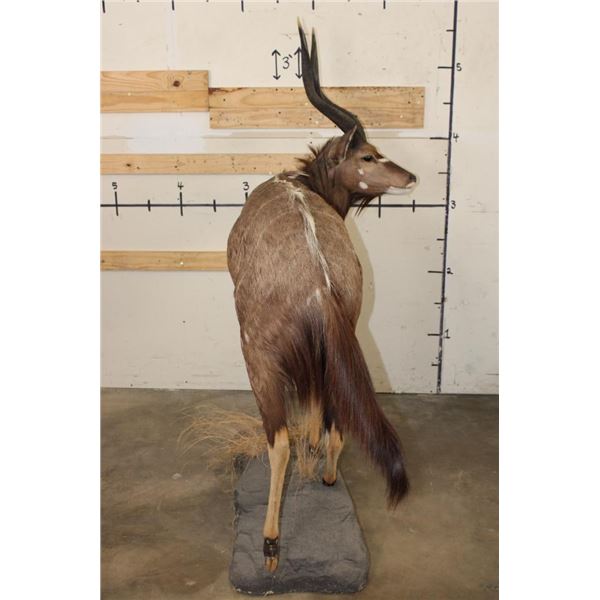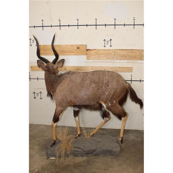 Very Nice, Clean, and Newer Life-sized NYALA on a simulated Rock Base. The Right Horn measures 24.75" Long and the Left Horn measures 25" Long. The Total Mount measures 62" Long x 28.5" Wide x 67" Tall. TAXIDERMY