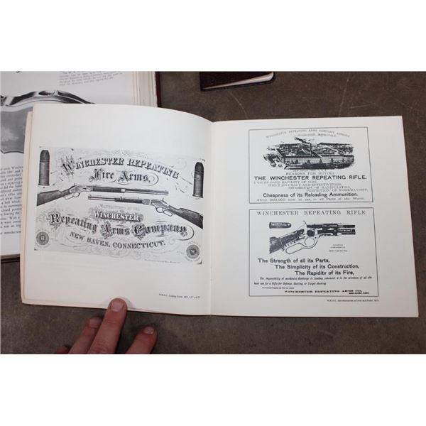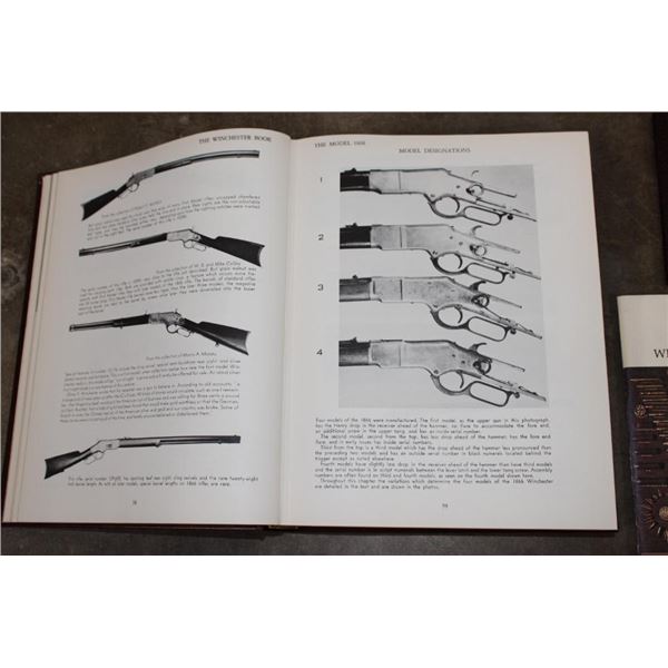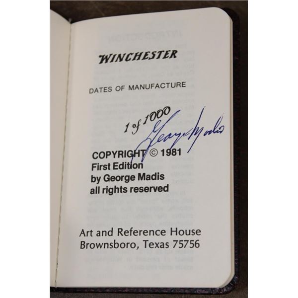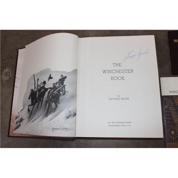 3 Winchester Books. "The Winchester Book" (1/1000) and the "Winchester Dates of Manufacture" (1/1000) signed by the author George Madis. "Winchester Promotional Arts" by George Madis (unsigned). (ONE$) COLLECTIBLE HUNTING AND GUN BOOKS