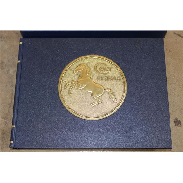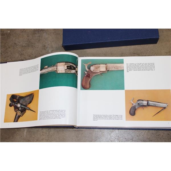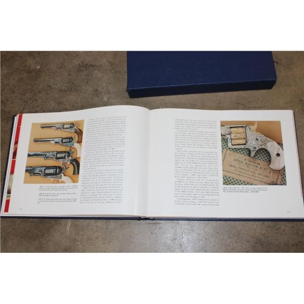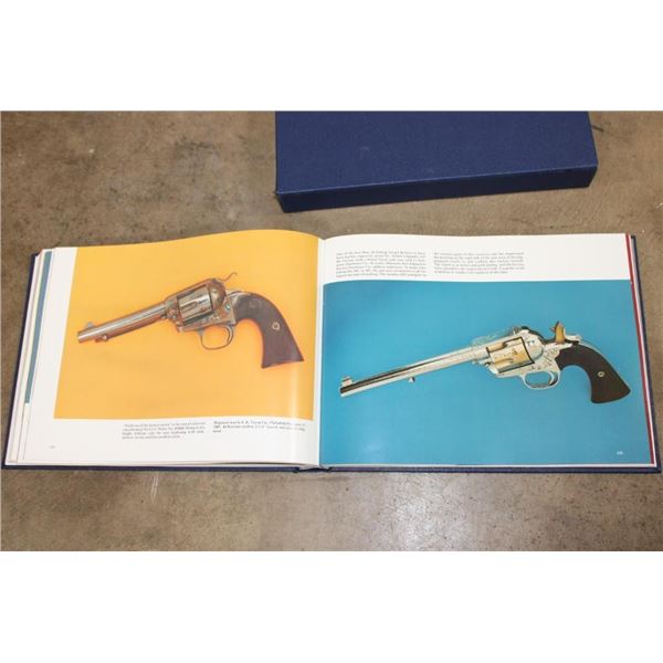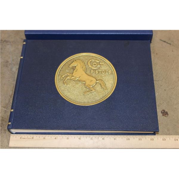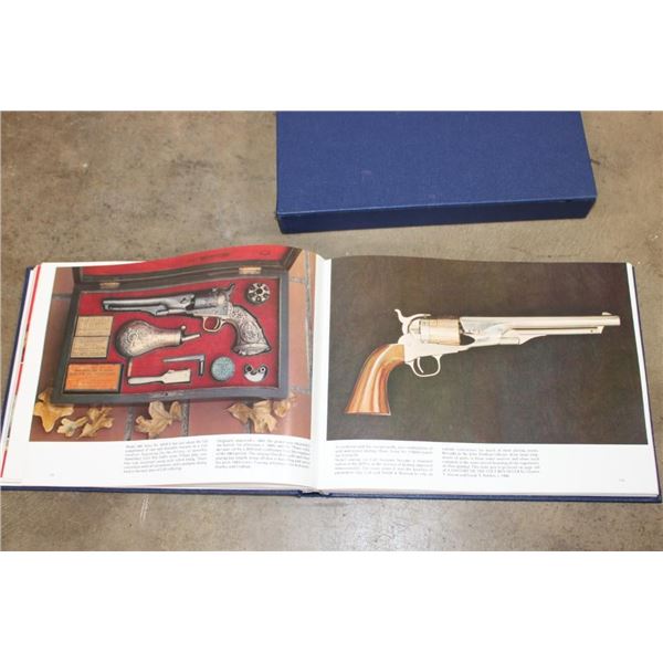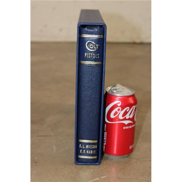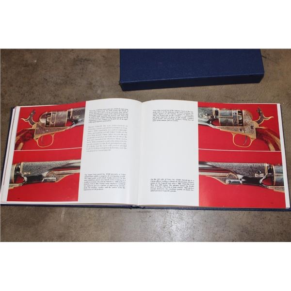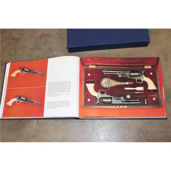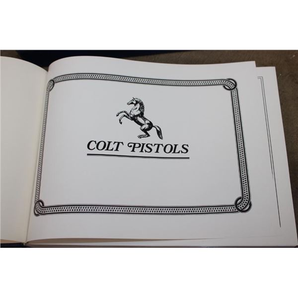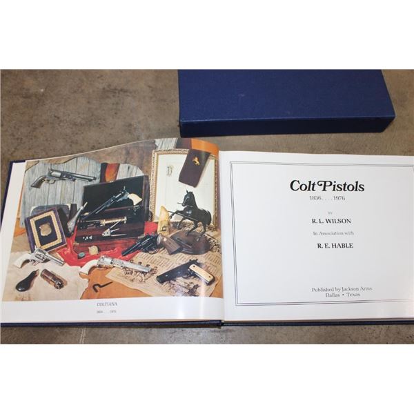 Collectible "Colt Pistols 1836-1976" Book by R. L. Wilson in its original sleeve case. First edition hard back binding in publisher's original deluxe navy leatherette covers, raised gilt stamped title and author lettering to the spine, large raised gold medallion to the front cover. Landscape. 9?'' x 12?''. 1 of 300 binding for this book, but it is not signed or numbered. R.L. Wilson (in Association with R.E. Hable) was an American inventor, industrialist and businessman who established Colt's Paten Fire-Arms Manufacturing Company and made the mass production of revolvers commercially viable. COLLECTIBLE GUN AND HUNTING BOOKS
