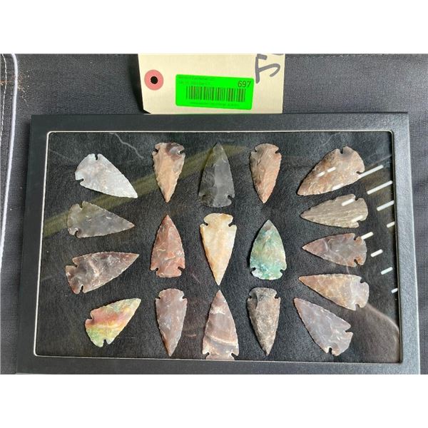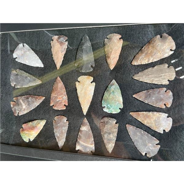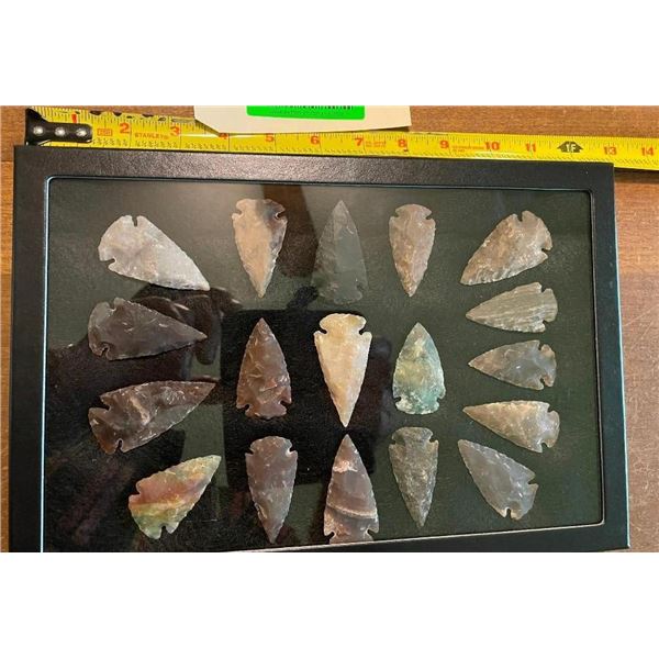 18 ARROWHEAD Points in an 8.25" Long x 6.25" Wide Glass Display Case. Native American Arrowheads were essential tools and weapons for hunting an warfare, they have been used for thousands of years. (ONE$) NATIVE AMERICAN ARTIFACTS