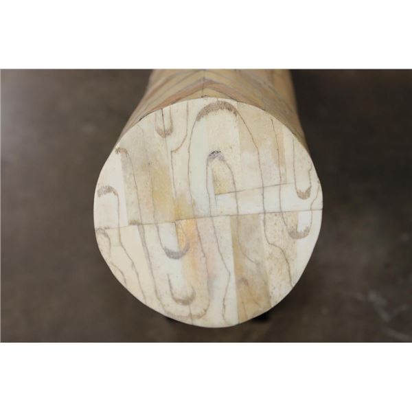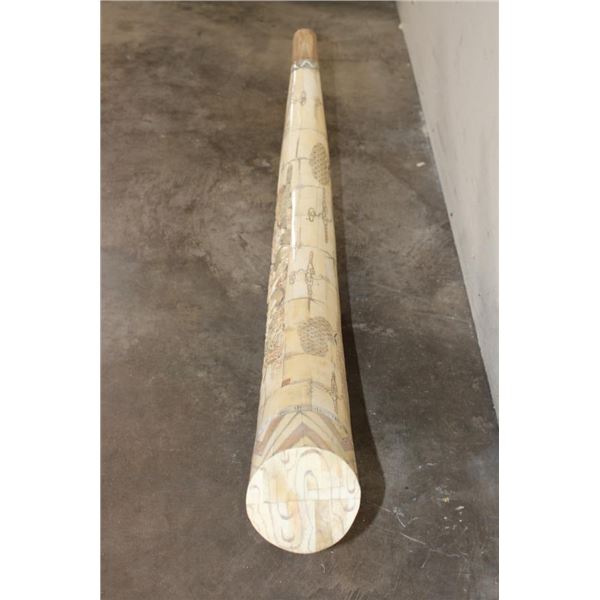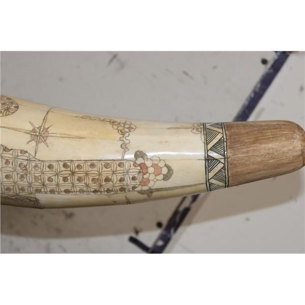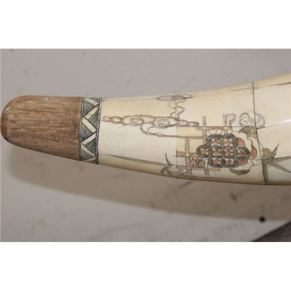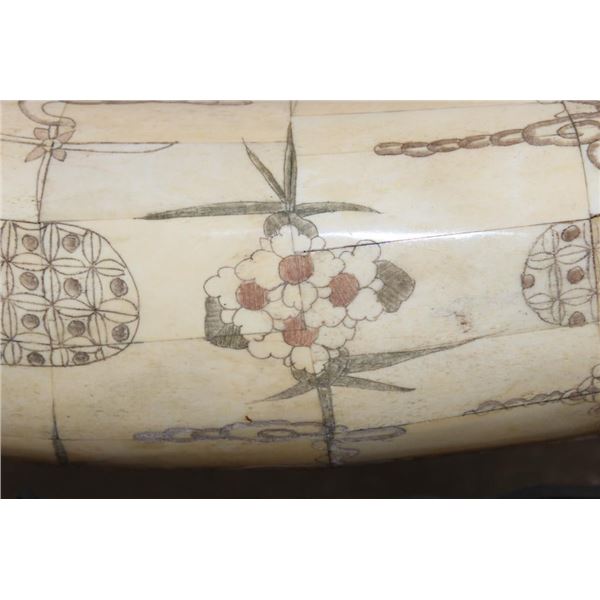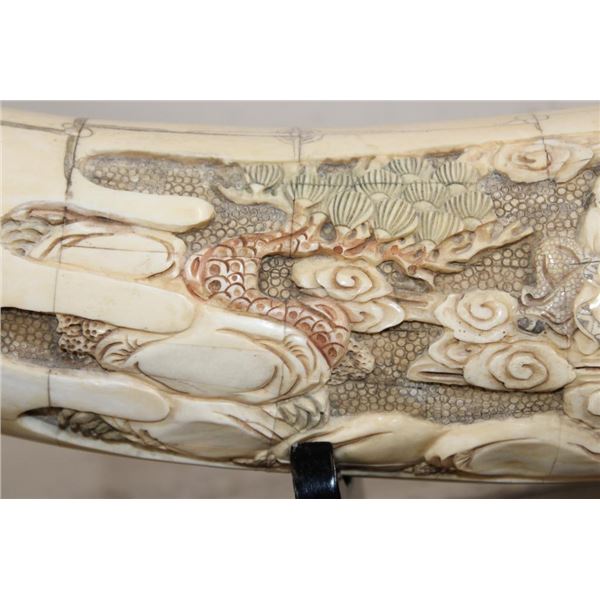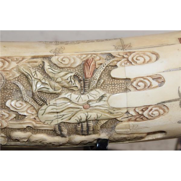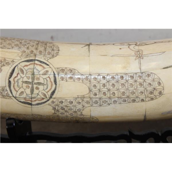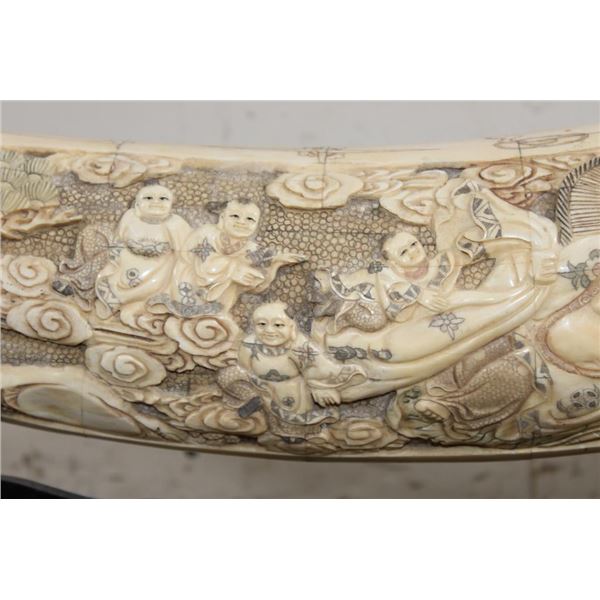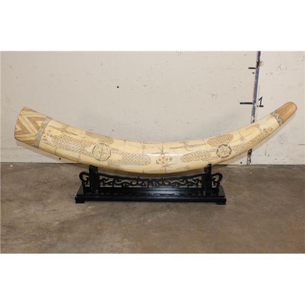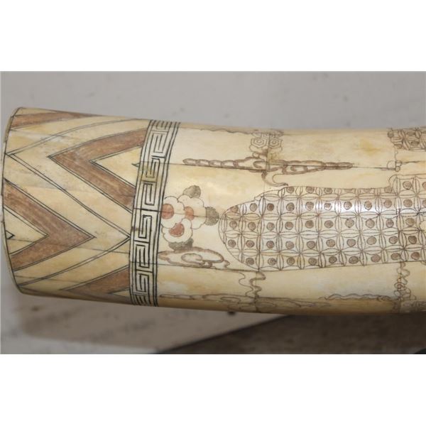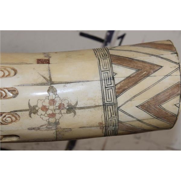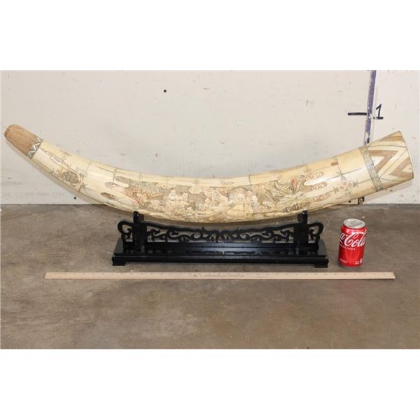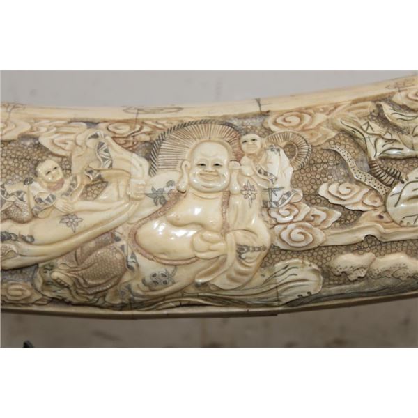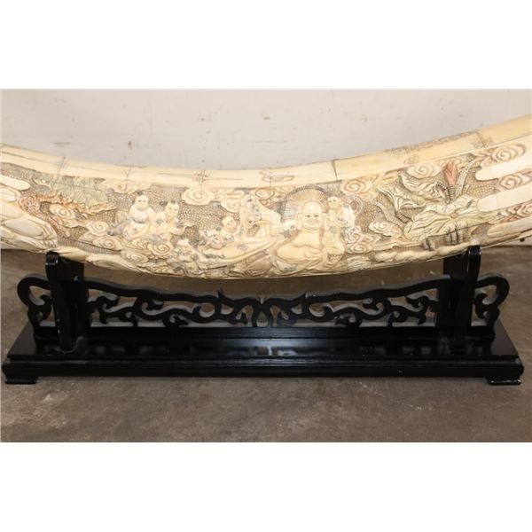 Antique early 20th Century Hand-carved and Scrimshawed Chinese Tusk or Horn made from Bone Plates. It sits atop a carved and lacquered stand. This sculpture is in the shape of an elephant tusk but is made out of bovine or ox bone. The piece is quite big, it measures 41" Long x 15" Tall x 4.5" Wide (on the stand). The surface bears beautiful hand-carvings of different scenes and Chinese ideograms like Buddha. It is in very good condition. COLLECTIBLE CHINESE ANTIQUE ART