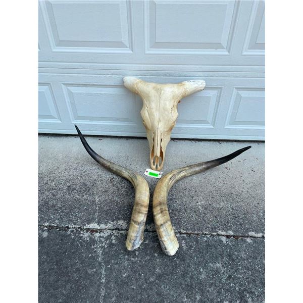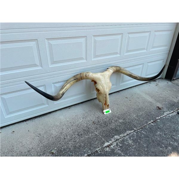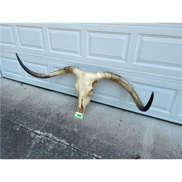 This Huge Texas LONGHORN STEER Skull has a 69" Horn Spread from Tip to Tip. The Big Texas Twist Horns measure 47" and 48" Long and are removable. These would make a bold statement in any western space such as a ranch, log cabin, or hunting lodge. TAXIDERMY