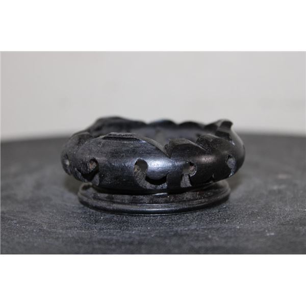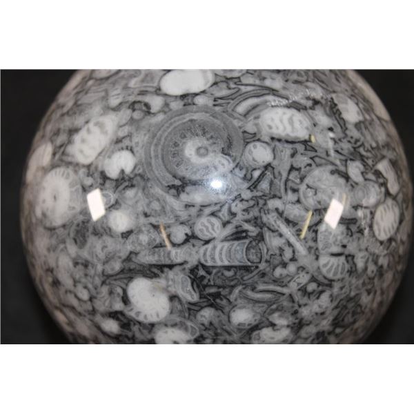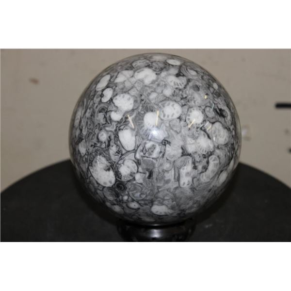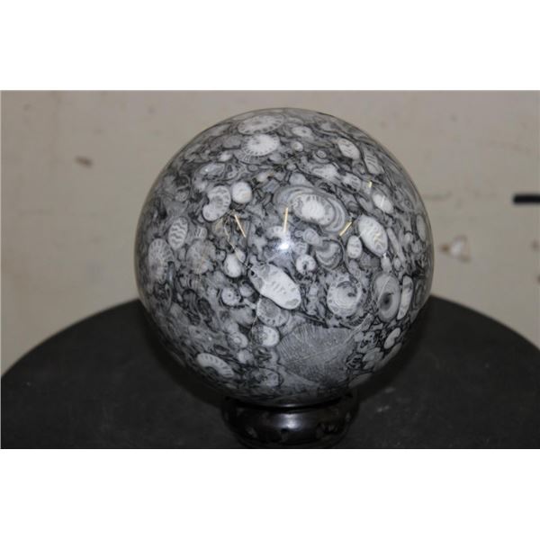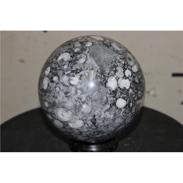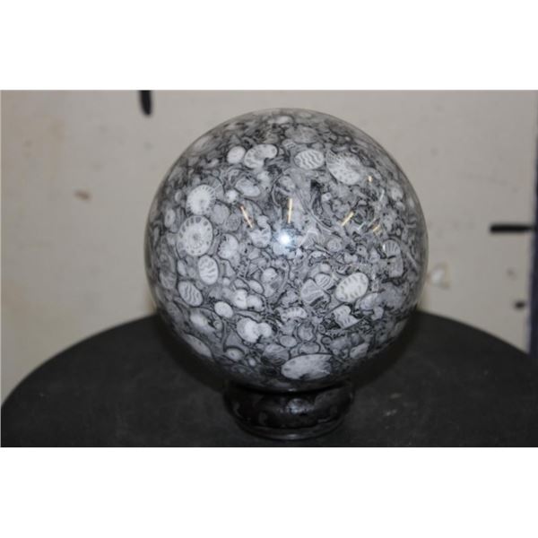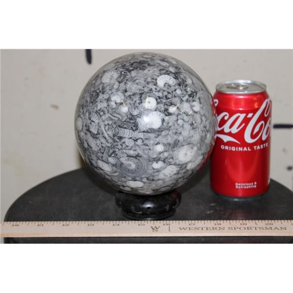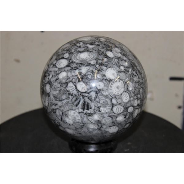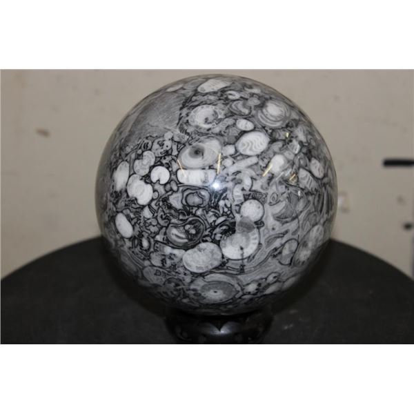 Big and *Rare* formed and polished CRINOID, AMMONITE and ORTHOCERAS Fossil Sphere. It measures 5.75" in Diameter and Weighs 9 lbs 11 oz. It has a hand-carved Wooden Display Stand. Crinoids are marine animals that lived millions of years ago and are often found as fossils in sedimentary rocks. The Sphere is black and white with a swirling pattern of the fossilized stems, giving it a unique appearance. ROCKS MINERALS FOSSILS