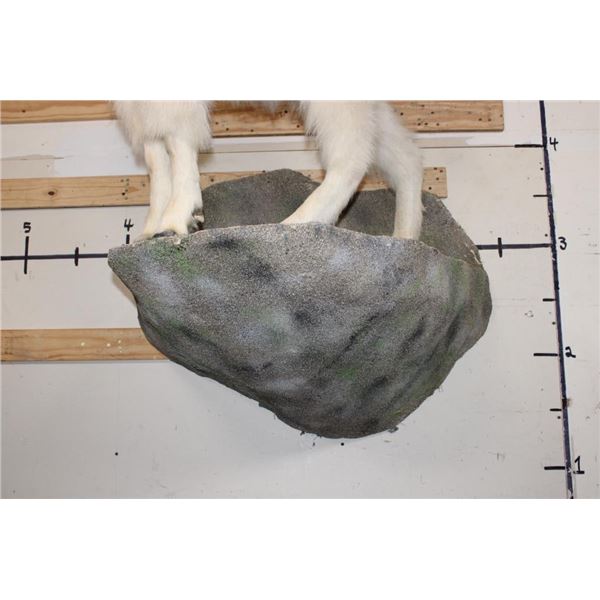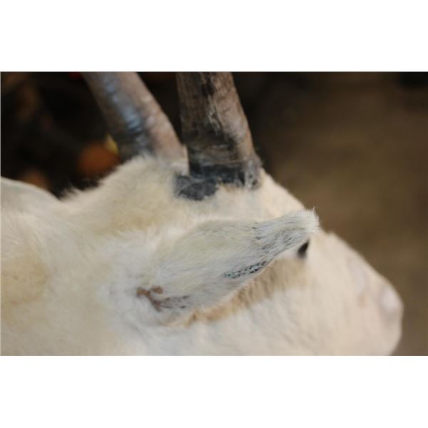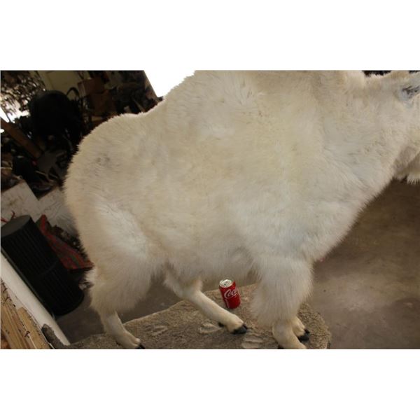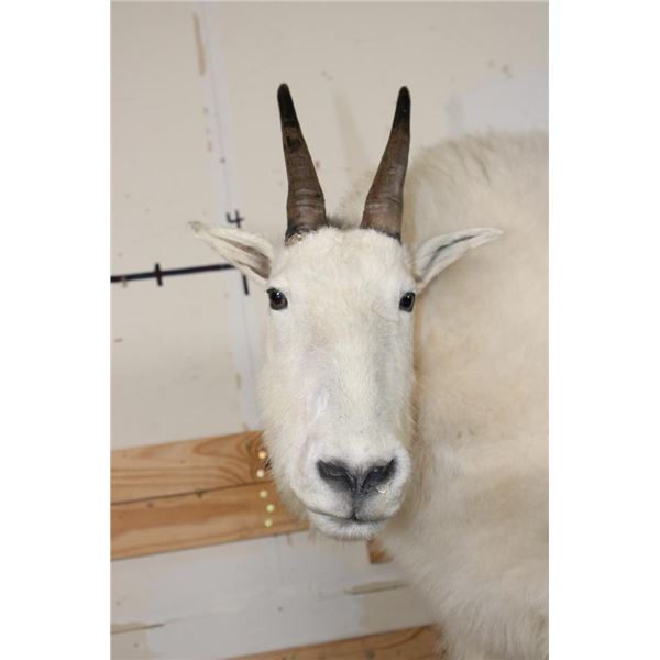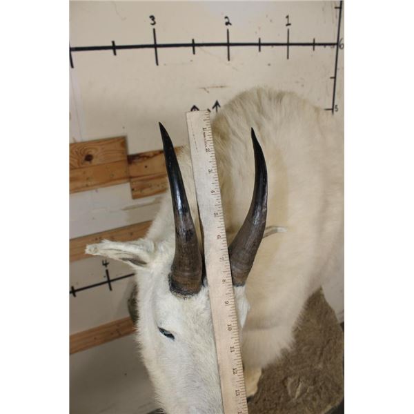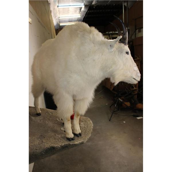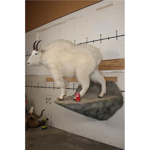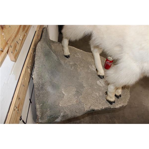 Older Life-sized MOUNTAIN GOAT on a Simulated Rock Wall Base in Good Condition. The Left Horn measures 8.25" Long and the Right Horn measures 8.5" Long. The Total Mount measures 40" Wide x 50" Tall x 32" Depth from the wall. TAXIDERMY
