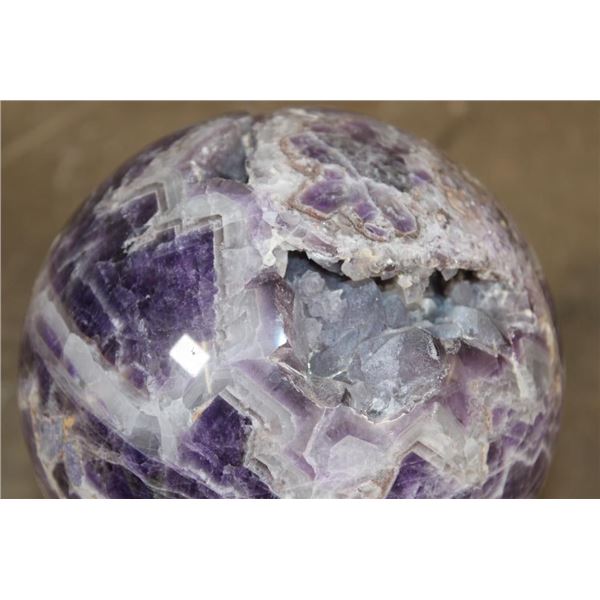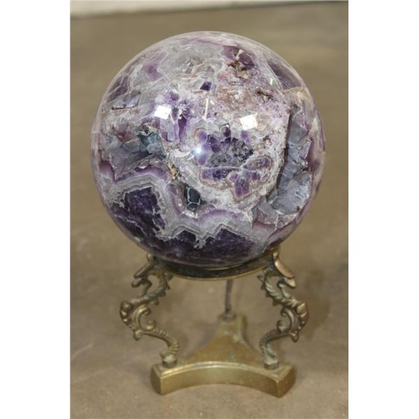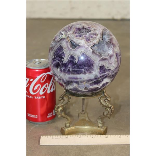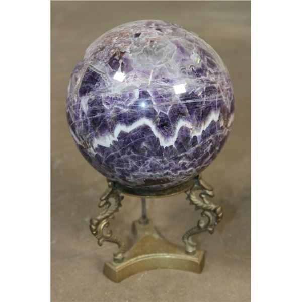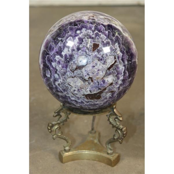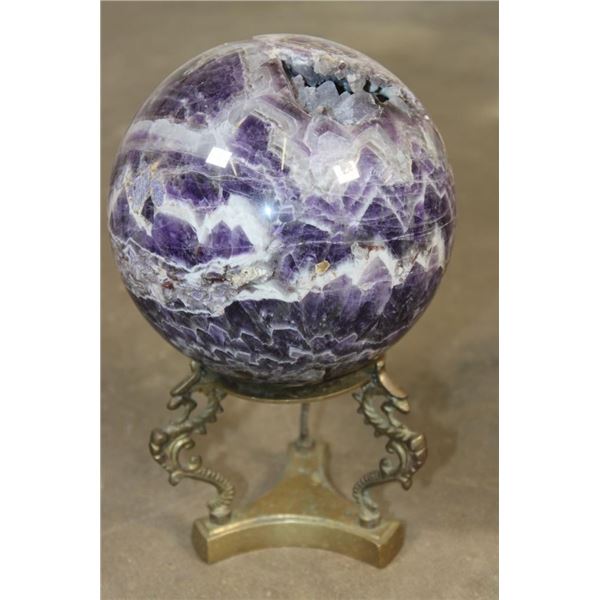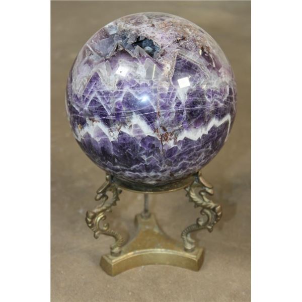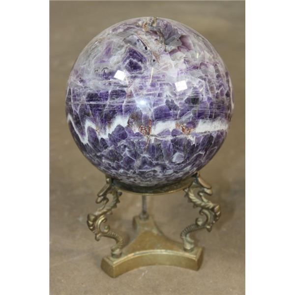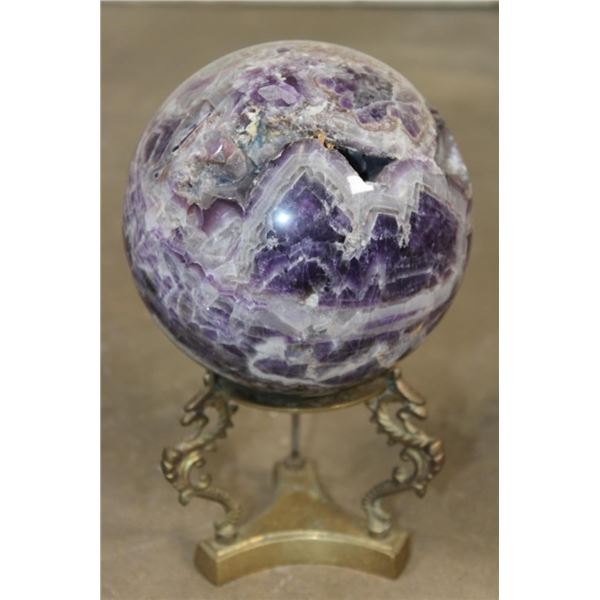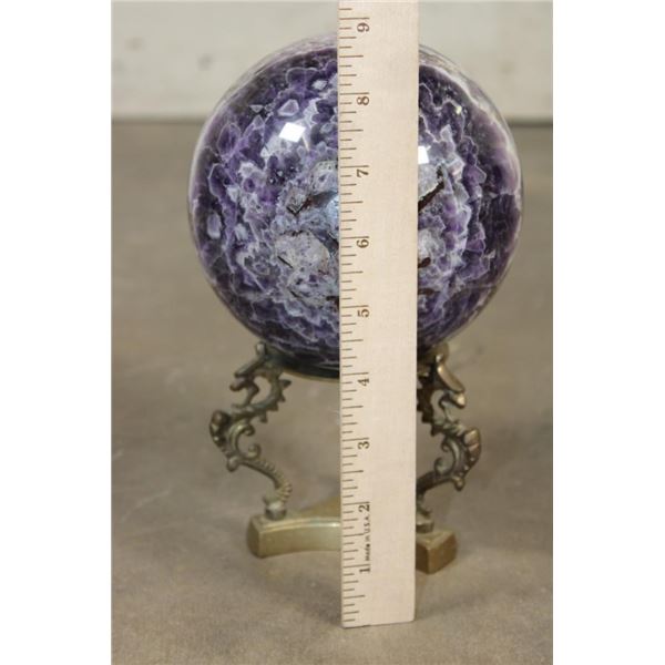 Big, Beautiful, and Polished DREAM AMETHYST Crystal Sphere with Inclusions. It measures 5 3/8" in Diameter and it Weighs 7 lbs 8 oz. It has a Brass Dragon Display Stand. ROCKS FOSSILS MINERALS