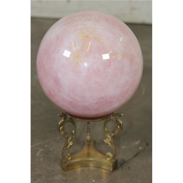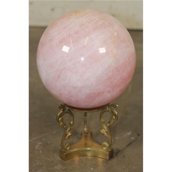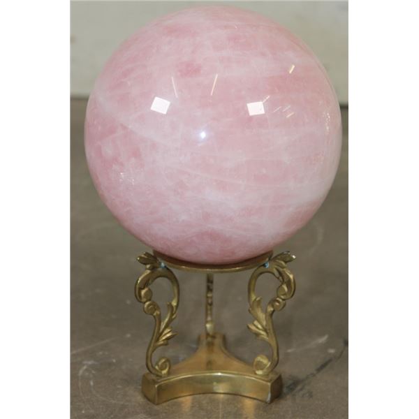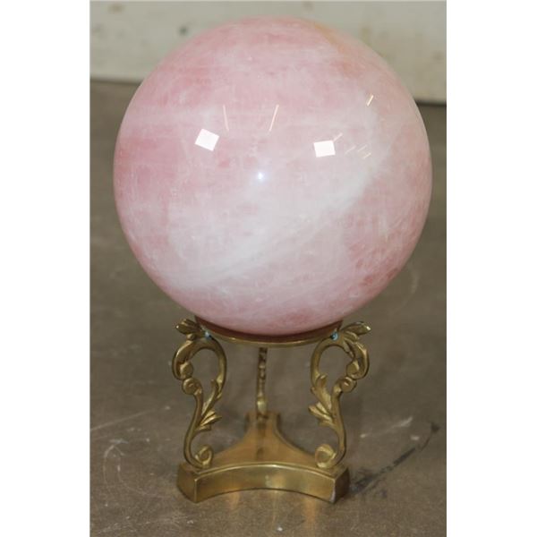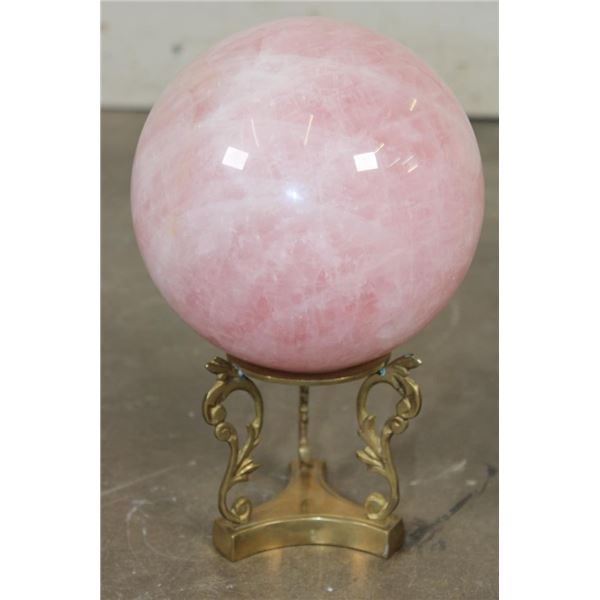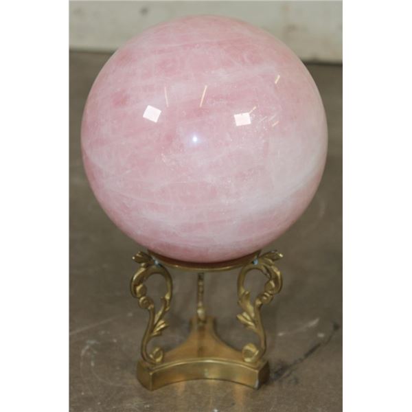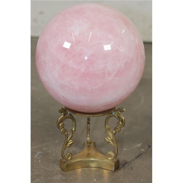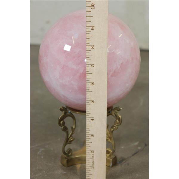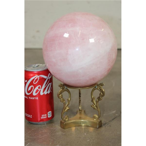 Lovely XL ROSE QUARTZ Crystal Sphere with a decorative Brass Display Stand. It measures 6.25" in Diameter and Weighs 11 lbs 10 oz. Rose Quartz is known for its soft pink color and association with love, compassion, and emotional healing. ROCKS MINERALS FOSSILS CRYSTALS