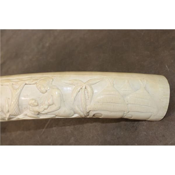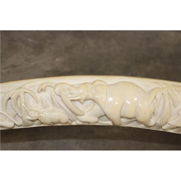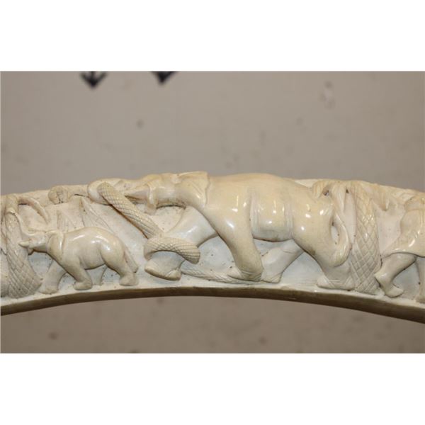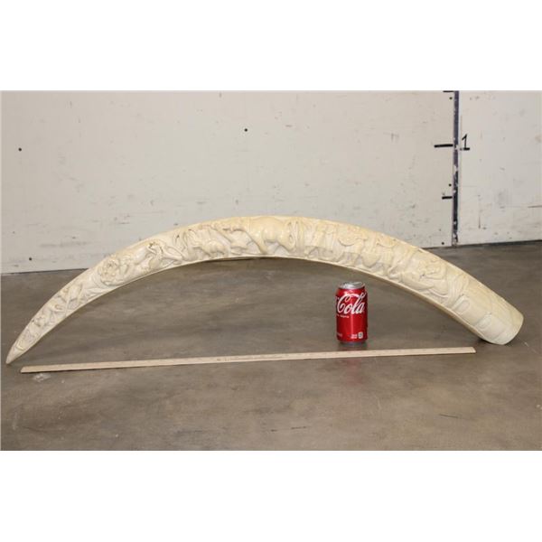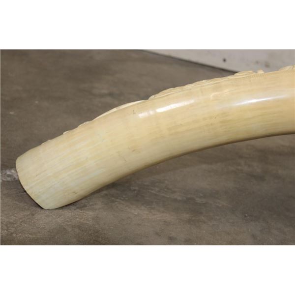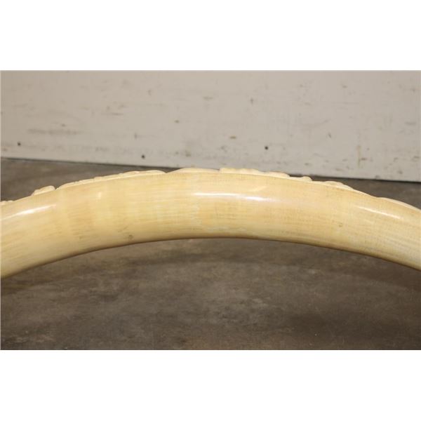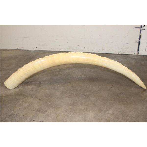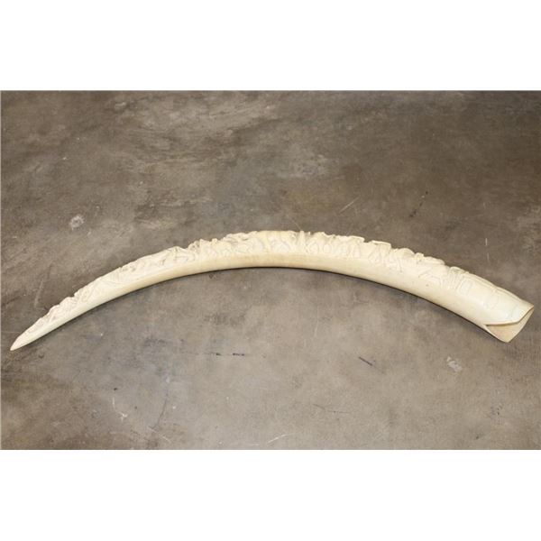 *TEXAS RESIDENTS ONLY*!!! Polished Hand-carved or Scrimshawed AFRICAN ELEPHANT IVORY Tusk. The carvings are of African animals set in a village scene. The Elephant Ivory Tusk measures 48.75" Long (around the curve) and 11.25" around the Tusk Base. The Total Weight is 14 lbs 14 oz. TAXIDERMY