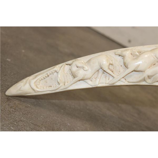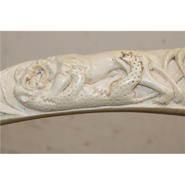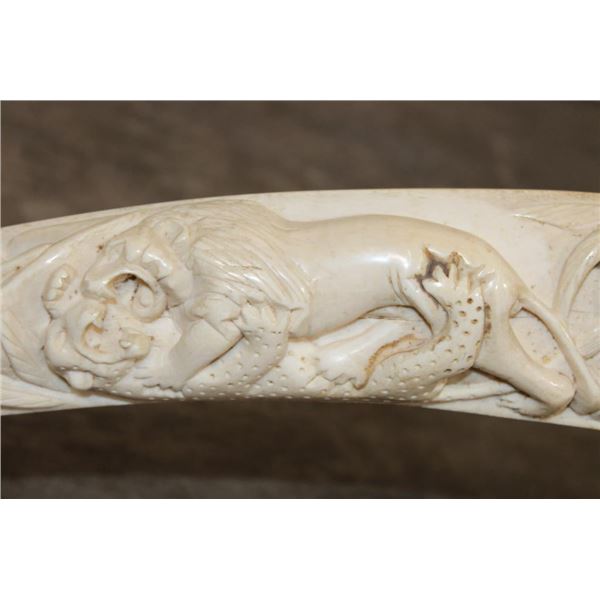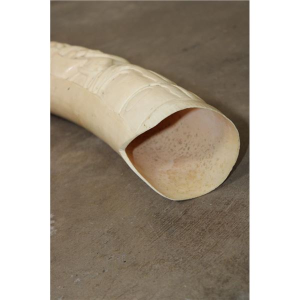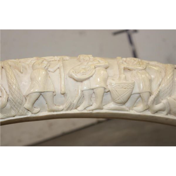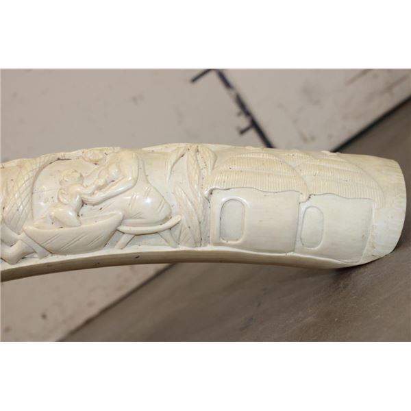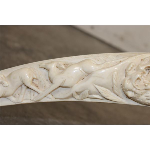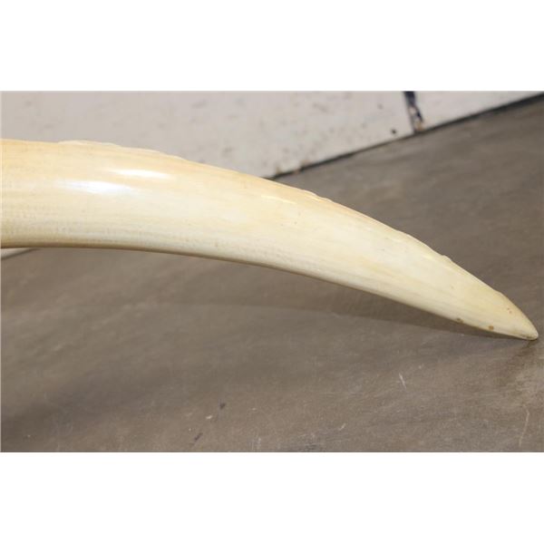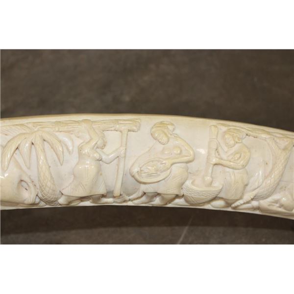 *TEXAS RESIDENTS ONLY*!!! Polished Hand-carved or Scrimshawed AFRICAN ELEPHANT IVORY Tusk. The carvings are of African animals set in a village scene. The Elephant Ivory Tusk measures 48.75" Long (around the curve) and 11.25" around the Tusk Base. The Total Weight is 14 lbs 14 oz. TAXIDERMY