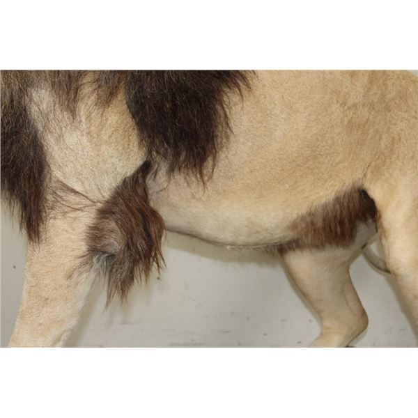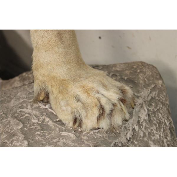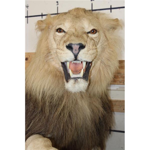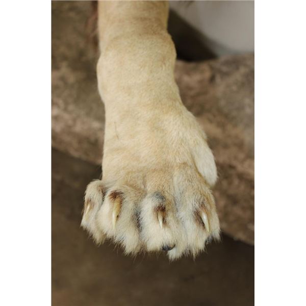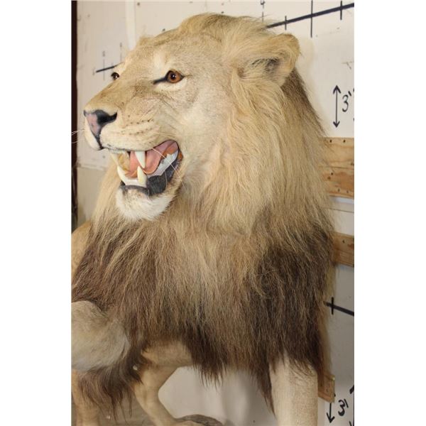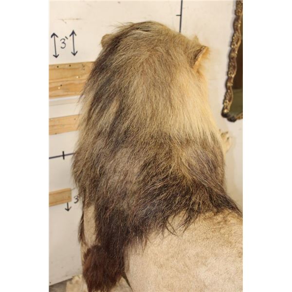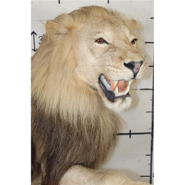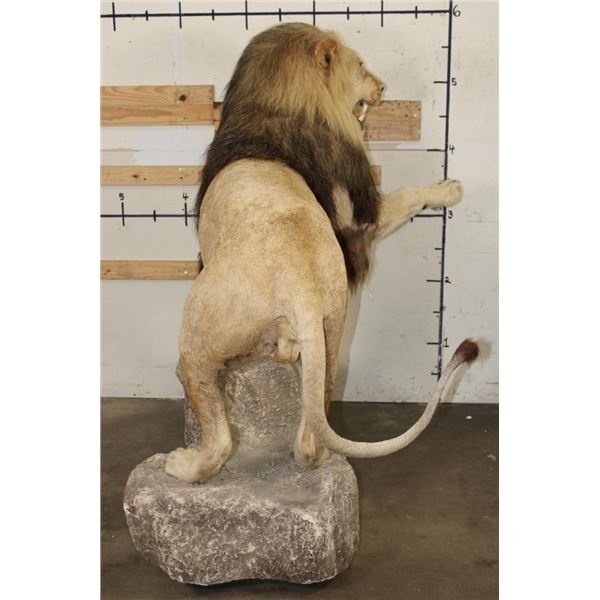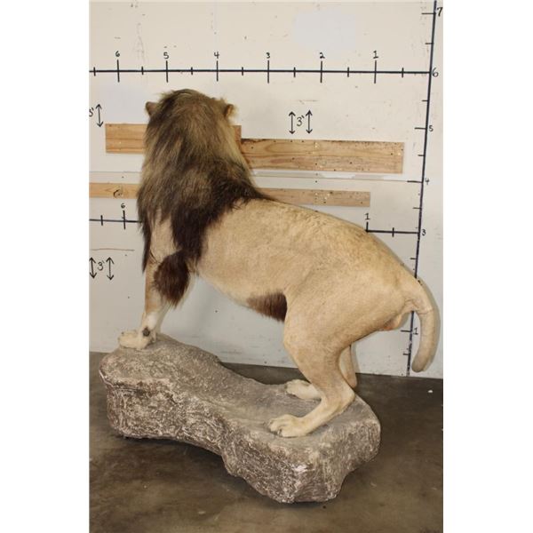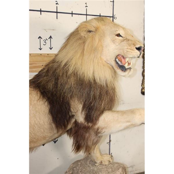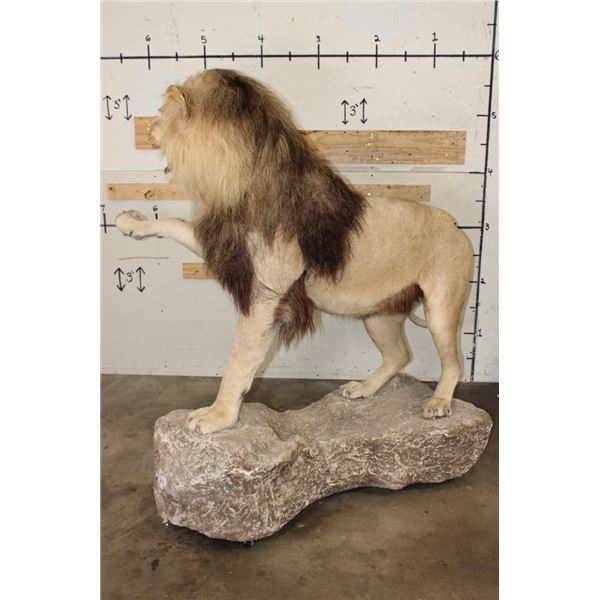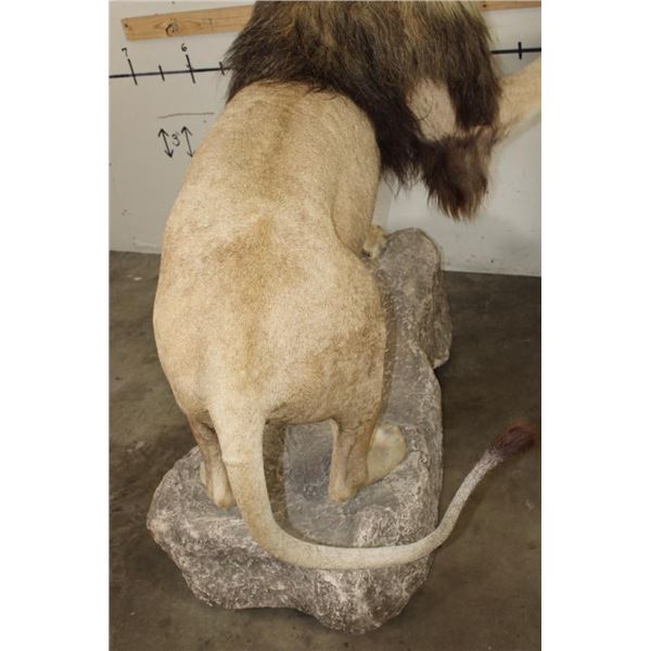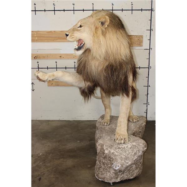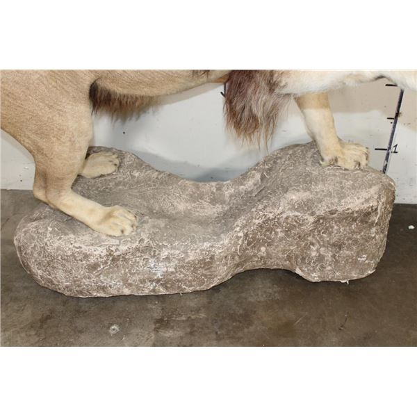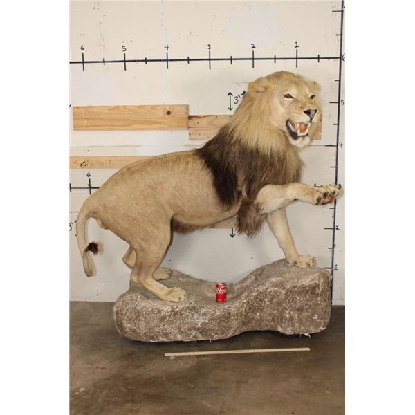 *TEXAS RESIDENTS ONLY!!!* Very Nice and Big Life-sized AFRICAN LION. It has a great face, all its claws, and an XXL Thick Mane. He is mounted in a cool pose on a reproduction rock Base with Wheels. Total measurements are 67" Long x 46" Wide x 68" Tall. This mount is in Very Good Condition. TAXIDERMY