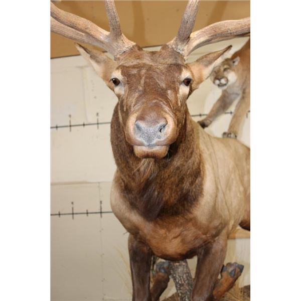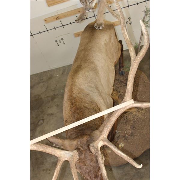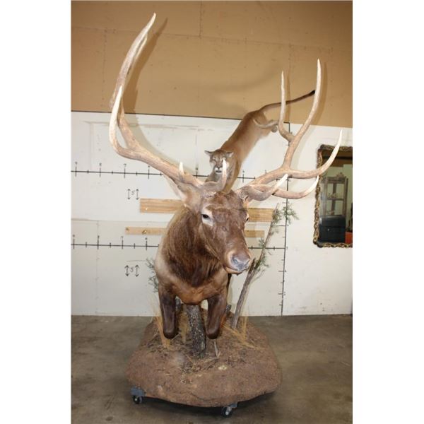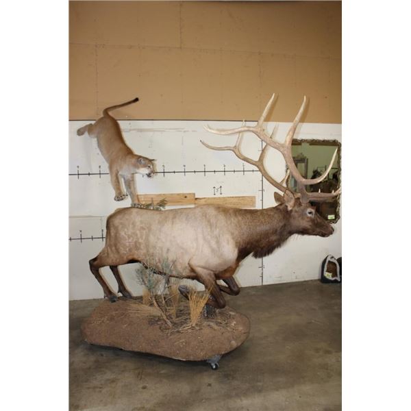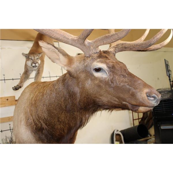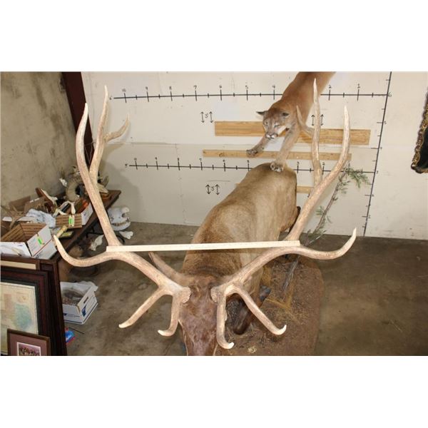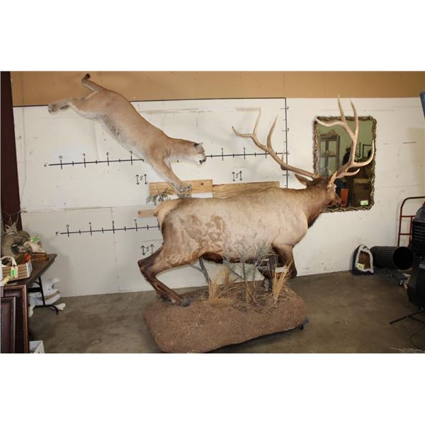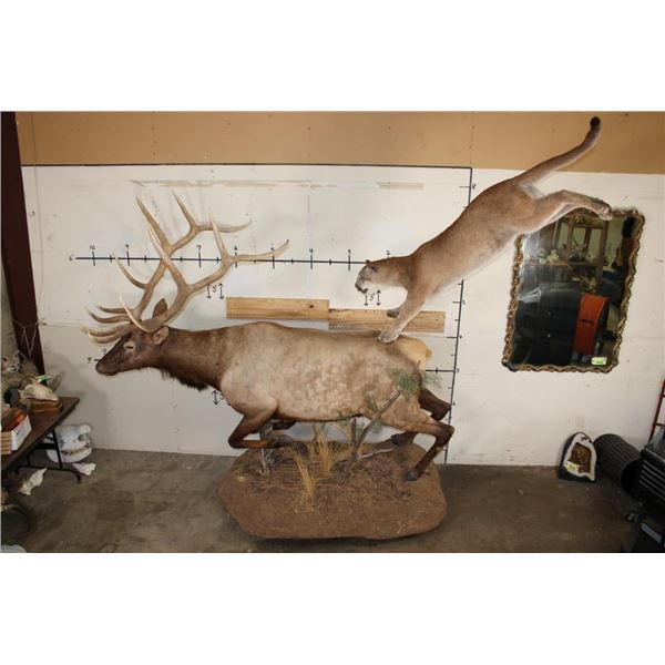 Very Unique mount of a Life-sized MOUNTAIN LION Leaping onto a Big Life-sized BULL ELK. The Mountain Lion is beautiful and has a great face. It has All its Claws and is removable. He measures 9'6" Tall and is in Very Good Condition. The Bull Elk has 12-Points and a 48.25" Spread with removable antlers. It measures 9'3" Long x 4' Wide. The Trees are also removable. TAXIDERMY