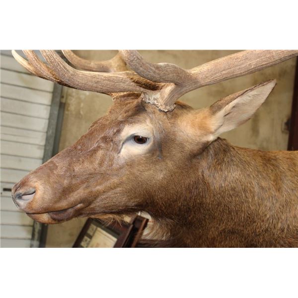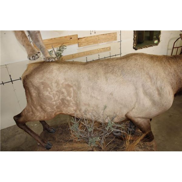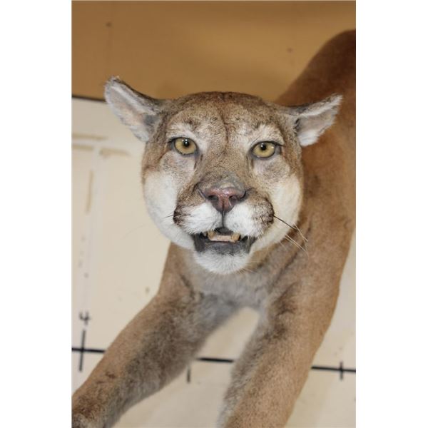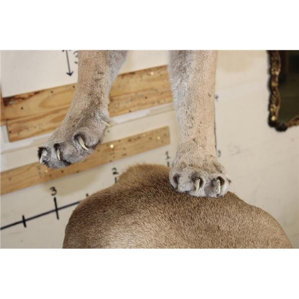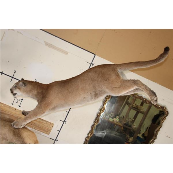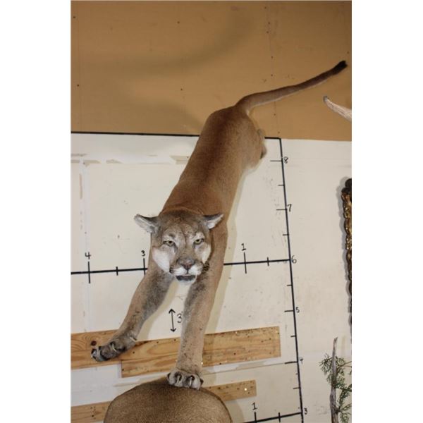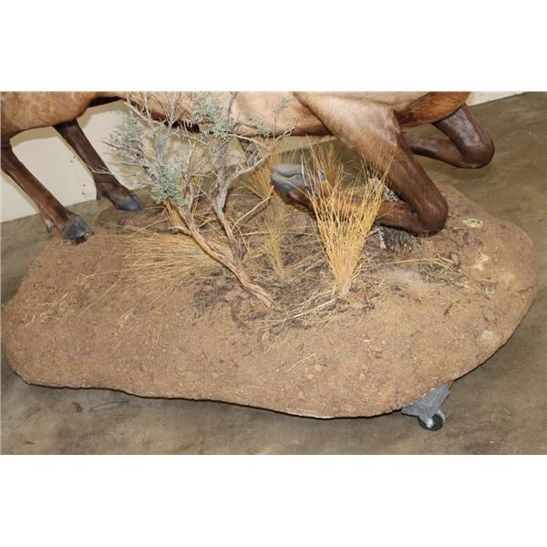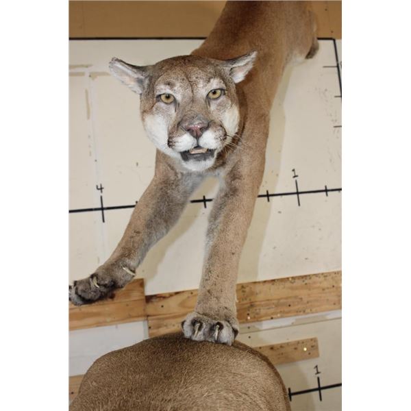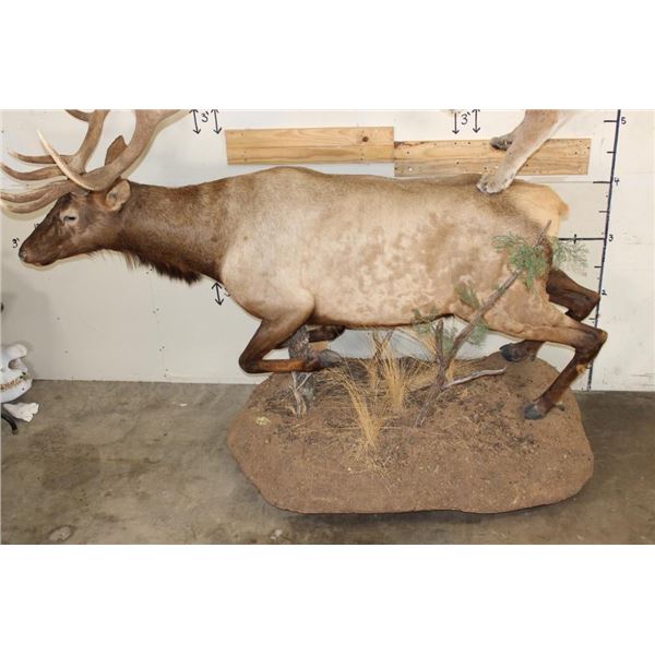 Very Unique mount of a Life-sized MOUNTAIN LION Leaping onto a Big Life-sized BULL ELK. The Mountain Lion is beautiful and has a great face. It has All its Claws and is removable. He measures 9'6" Tall and is in Very Good Condition. The Bull Elk has 12-Points and a 48.25" Spread with removable antlers. It measures 9'3" Long x 4' Wide. The Trees are also removable. TAXIDERMY