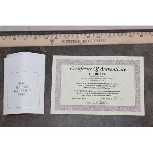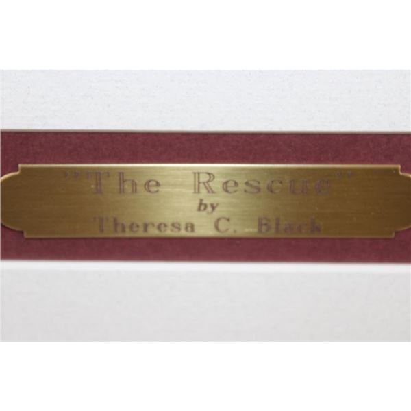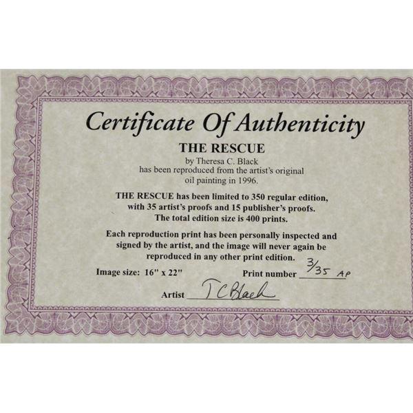 "The Rescue" Limited Edition artist Proof or Print. It has been signed by the artist Theresa C. Black and numbered #3/35. It is inside a lovely wood frame that measures 31" Wide x 21" Tall. It is complete with a letter from the artist and a signed Certificate of Authenticity-"Each reproduction print as been personally inspected and signed by the artist, and the image will never again be reproduced in any other print edition". COLLECTIBLE ART PROOFS AND PRINTS