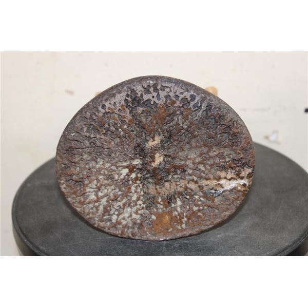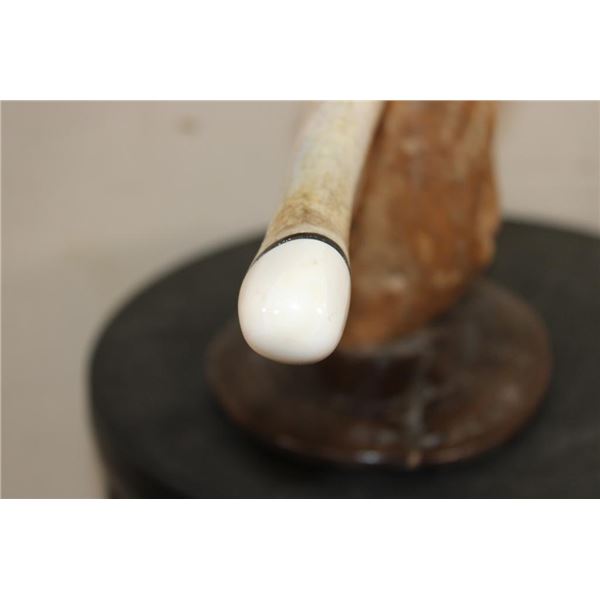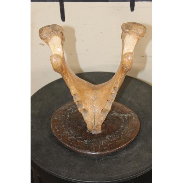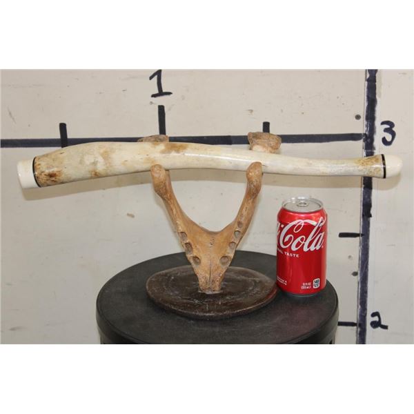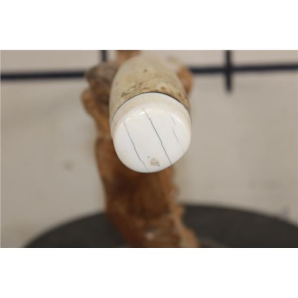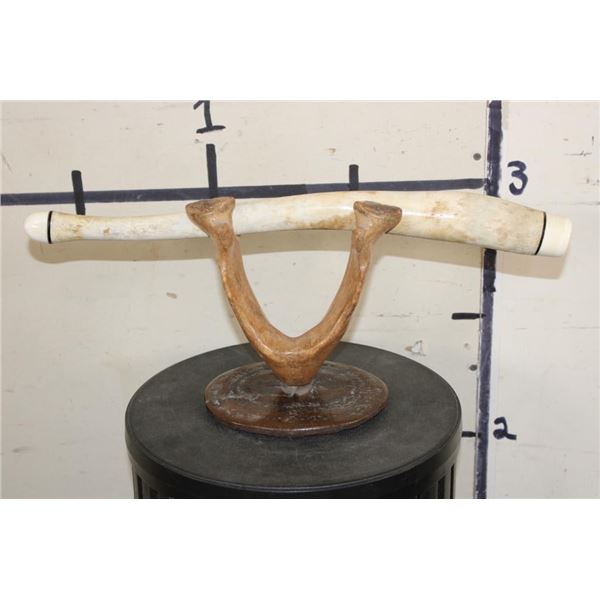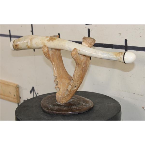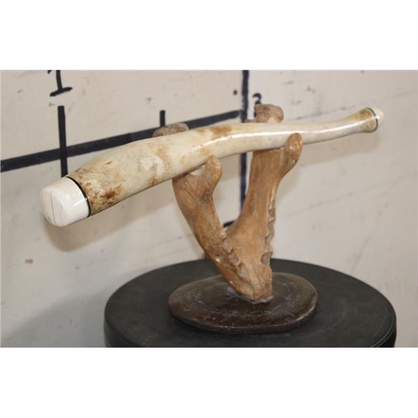Very Old WALRUS OOSIK or Bacculum (Penile Bone) with Walrus Tusk IVORY Caps on Each End. It is displayed on a custom Walrus Jaw and Fossilized WHALE Vertebrae Stand. It is signed by artist "HK". TAXIDERMY