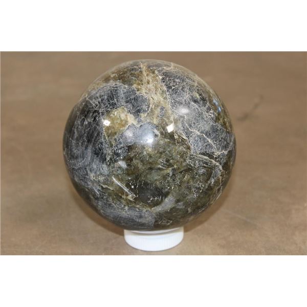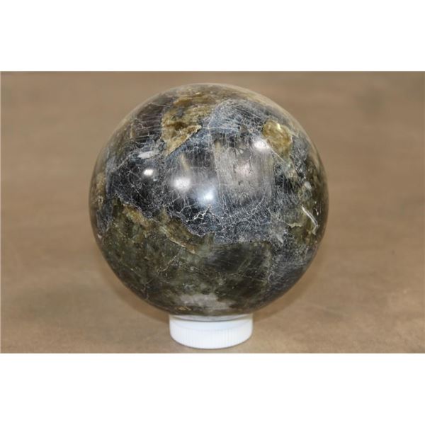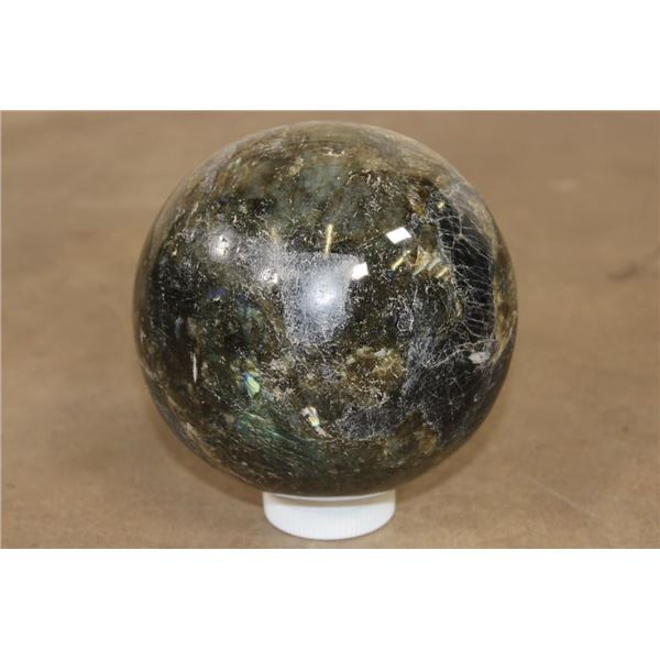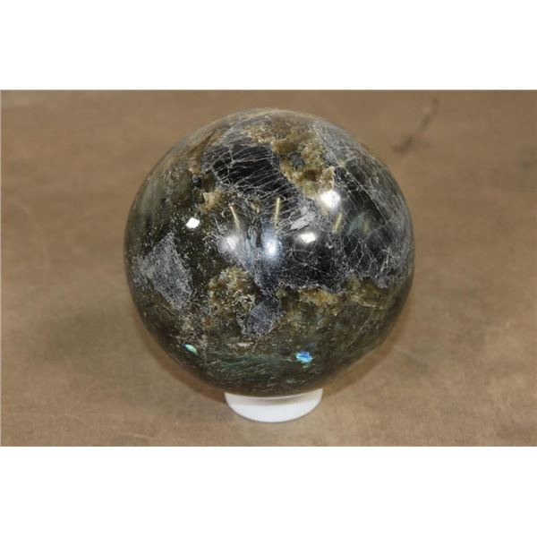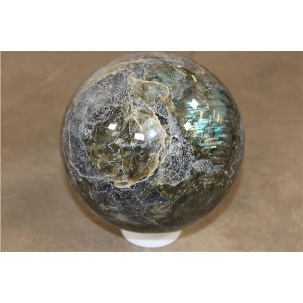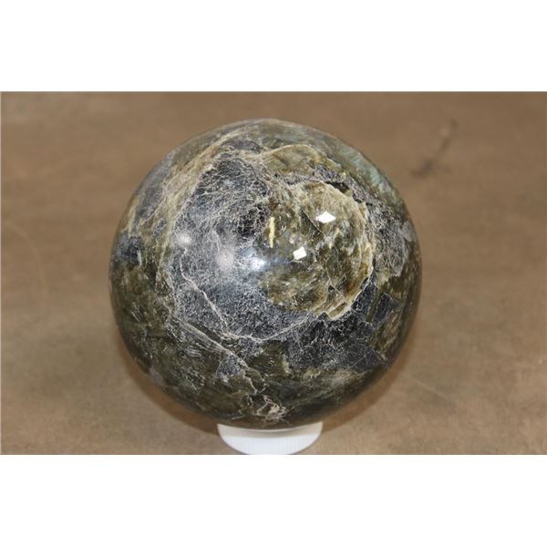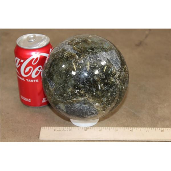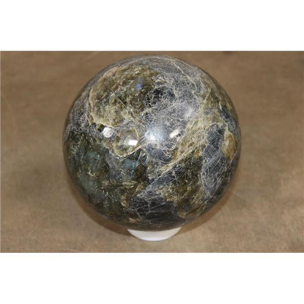 Big Formed and Polished Natural Green LABRADORITE Semi-precious Mineral Sphere. It measures 5.5" in Diameter and the Total Weight is 9 lbs 8 oz. Labradorite is a feldspar mineral known for its iridescent colors and metaphysical properties. It is believed to facilitate transformation, promote self discovery, and enhance intuition. ROCKS FOSSILS MINERALS CRYSTALS