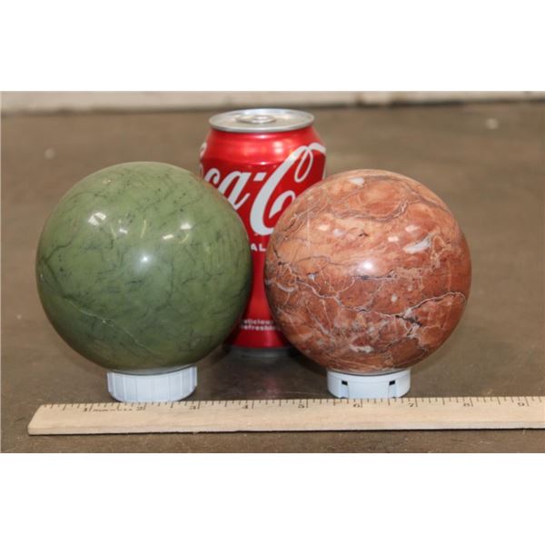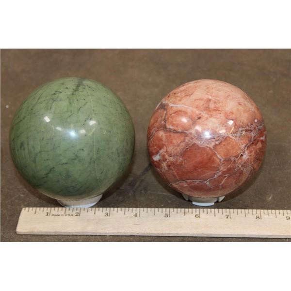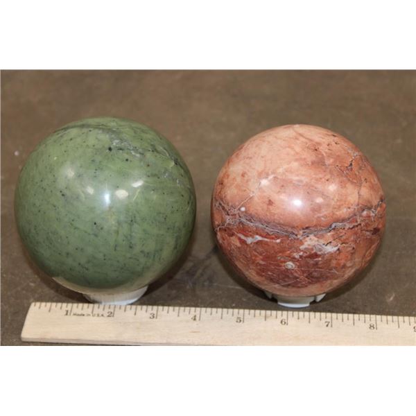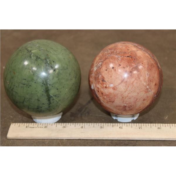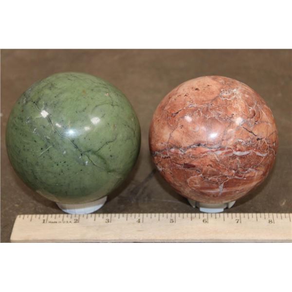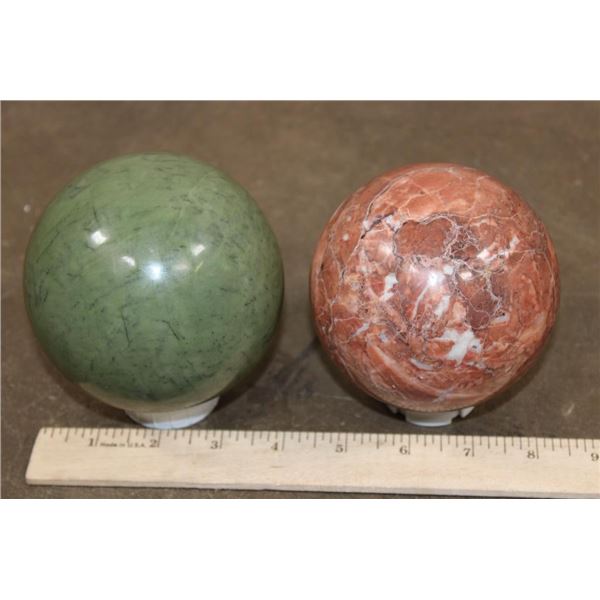 2 Mineral Spheres. Pictured left is the GREEN JASPER Mineral Sphere. It measures 4 1/8" in Diameter and Weighs 3 lbs 14 oz. Pictured right is the RED CHERRY BLOSSOM AGATE Mineral Sphere. It measures 4" in Diameter and Weighs 3 lbs 4 oz. Green Jasper is believed to enhance spiritual growth and inner wisdom. Red Cherry Blossom Agate is a grounding tone that can be used to encourage self-growth and restore emotional balance. (ONE$) ROCKS MINERALS FOSSILS SPHERES