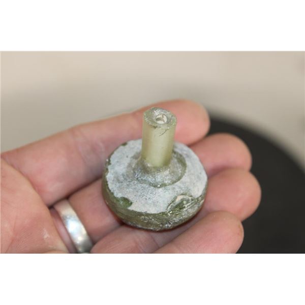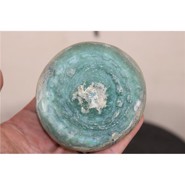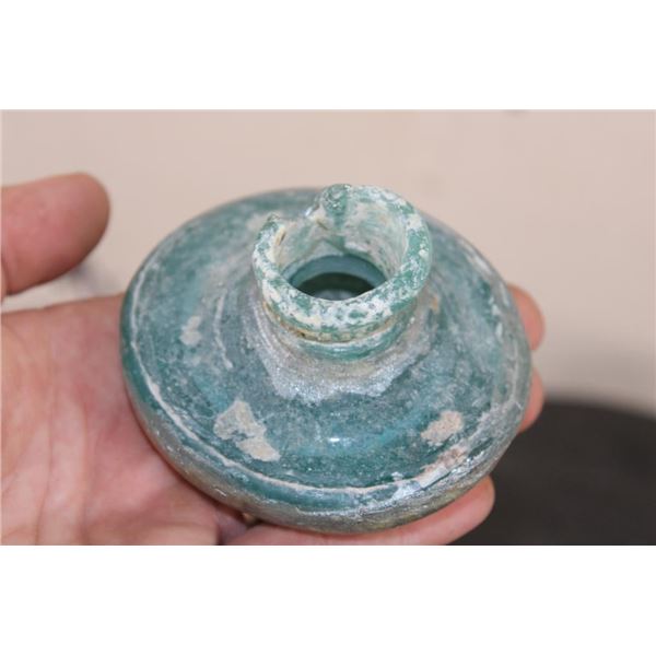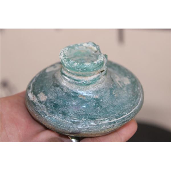 2 Beautiful Ancient Roman Glass Bottles. The larger bottle measures 3.5" in diameter x 2" Tall and weighs 189.91 g. The smaller bottle measures 1.5" Tall x 1.5" in Diameter and weighs 27.22 g. Roman glass dates back around 2,000 years, originating during the time of the Roman Empire. The production of glass in the Roman era significantly advanced with the invention of glassblowing around 50 BC. This innovation made glass more accessible and allowed for a wider variety of shapes and designs. (ONE$) ANCIENT ARTIFACTS