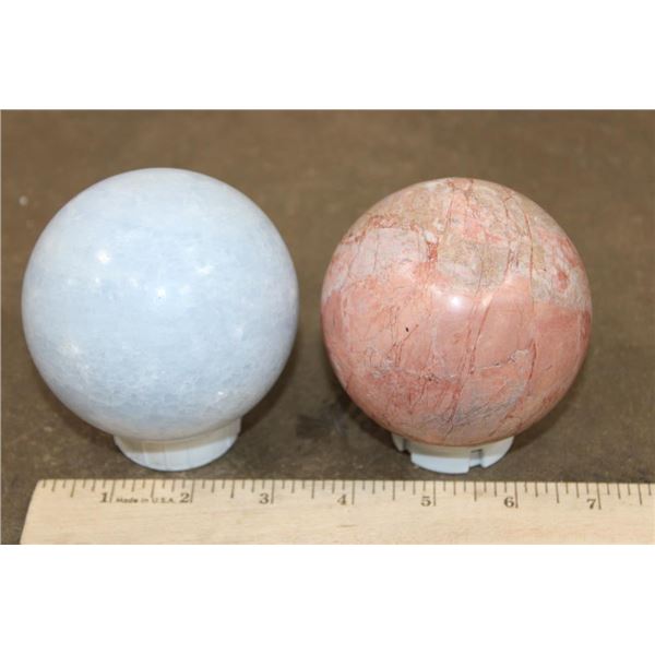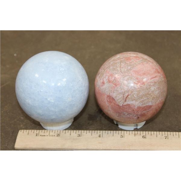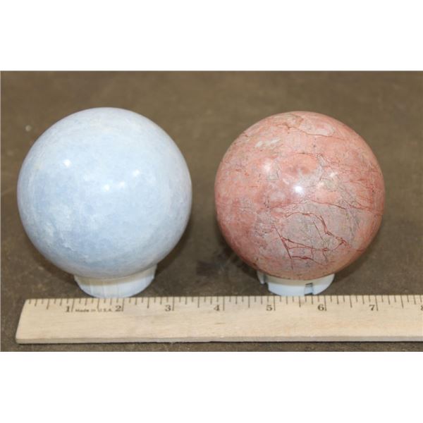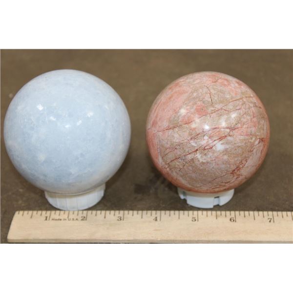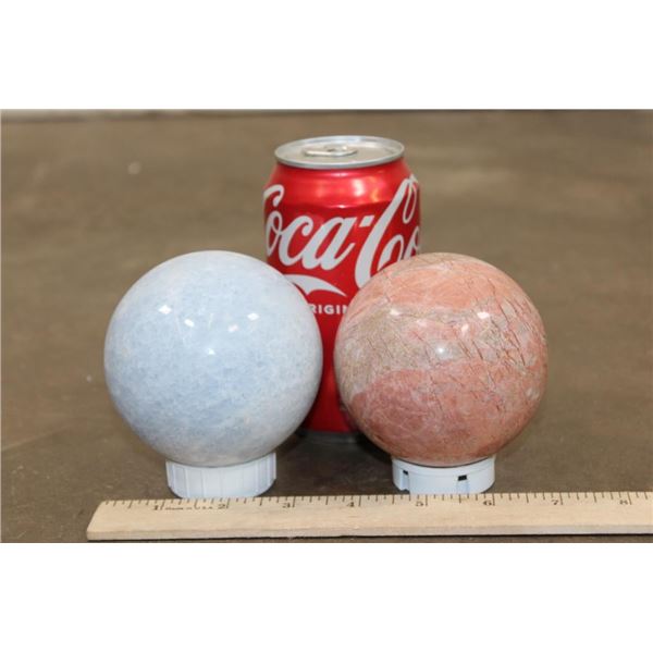 2 Mineral Spheres. Pictured left is the BLUE CELESTITE Mineral Sphere. It measures 3.5" in Diameter and Weighs 2 lbs 1 oz. Pictured right is the PEACH MOONSTONE Mineral Sphere. It measures 3 3/8" in Diameter and Weighs 1 lb 15 oz. Blue Celestite is a crystal associated with divine connection, spiritual clarity, and tranquility. Peach Moonstone is known for its gentle and soothing energy, particularly beneficial for emotional balance and healing. (ONE$) ROCKS MINERALS FOSSILS SPHERES