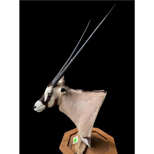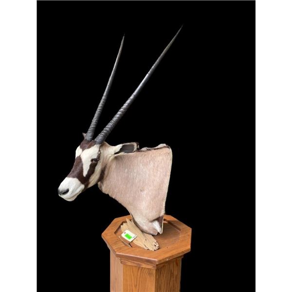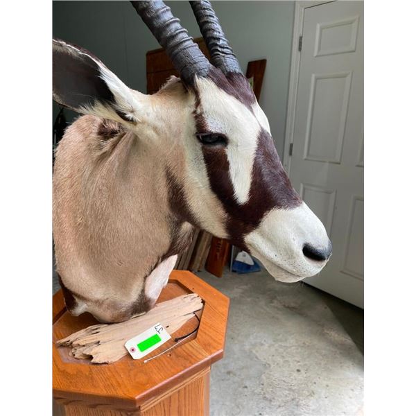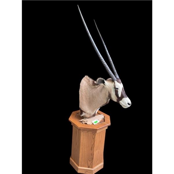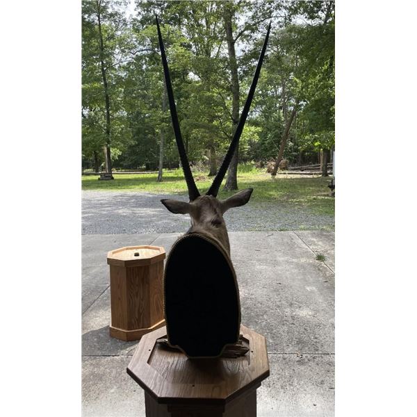 Large Trophy Size AFRICAN GEMSBOK Pedestal Mount. He is sitting on top of a beautiful octagon shaped Oak Base. The Horns measure 37.5" Long and 38" Long with a 19" Spread. TAXIDERMY