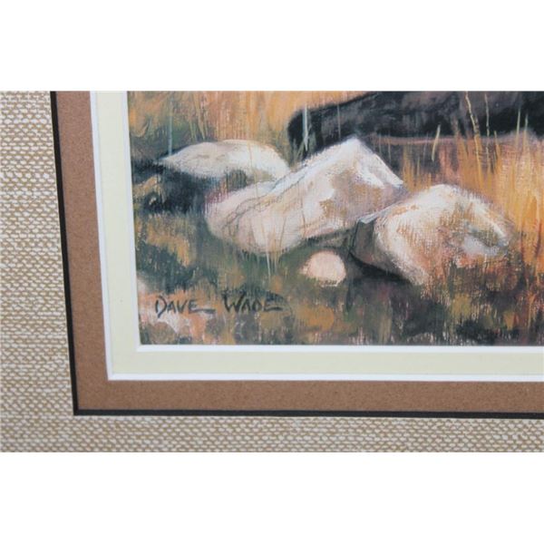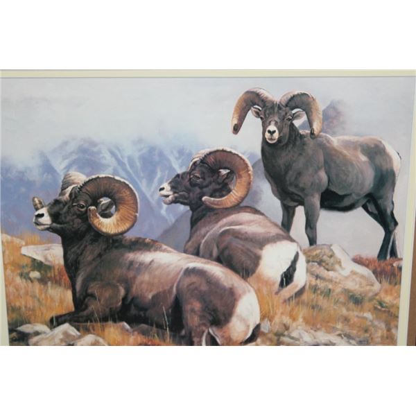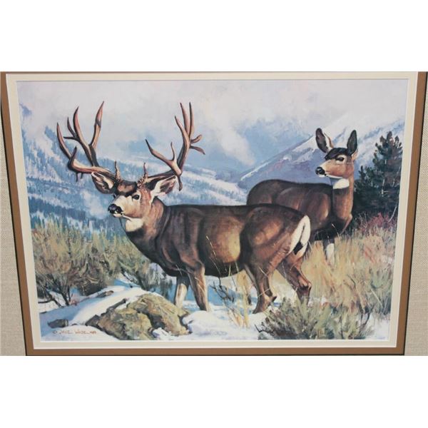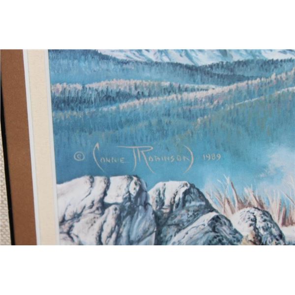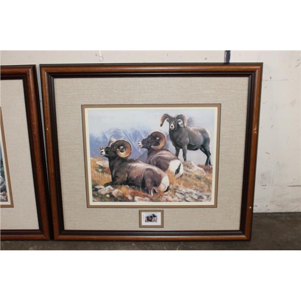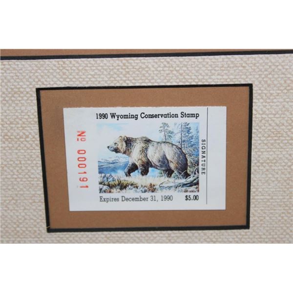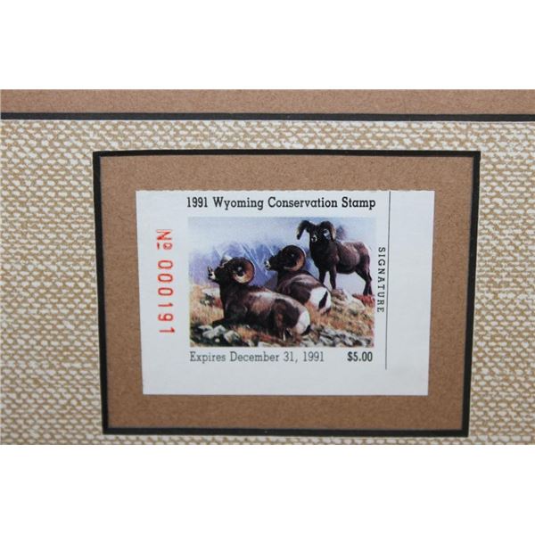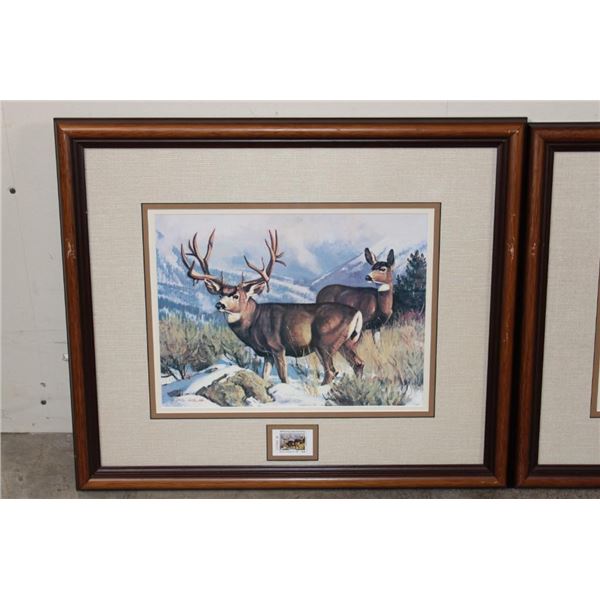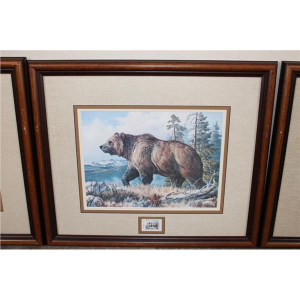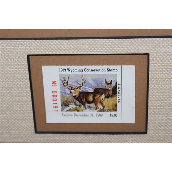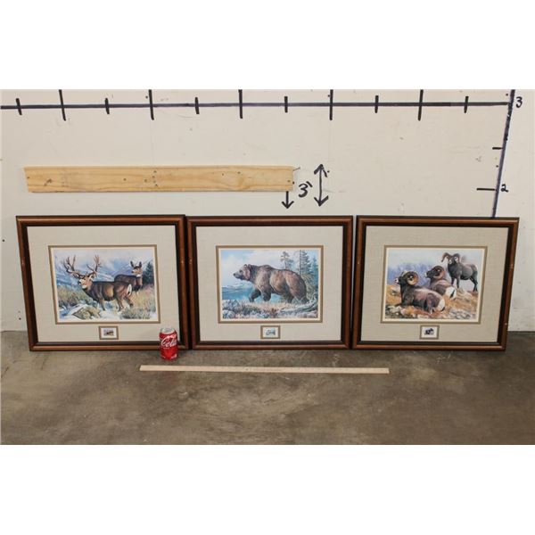 3 Framed Wyoming Conservation Stamps with Art Prints 1989-1991. They are each in matching 23.5" Wide x 21" Tall glass and wood frames. 2 are by the artist Dave Wade and 1 is by Connie Robinson. COLLECTIBLE WILDLIFE STAMPS AND ART