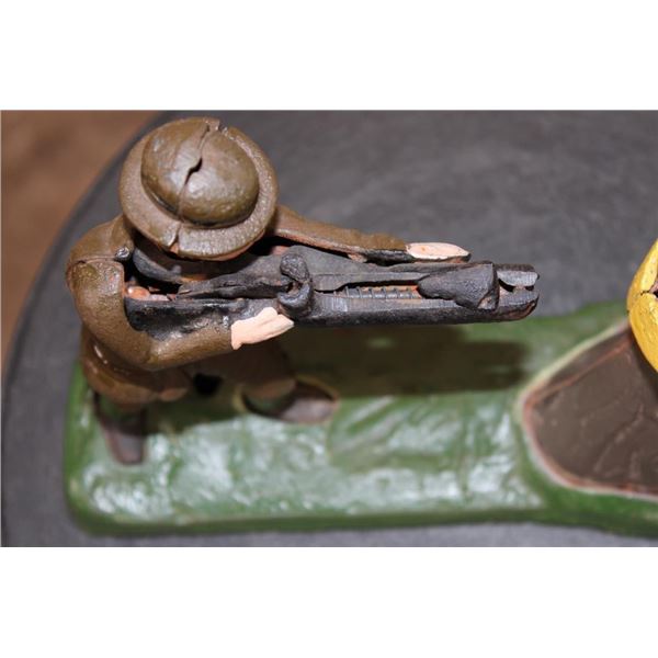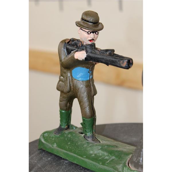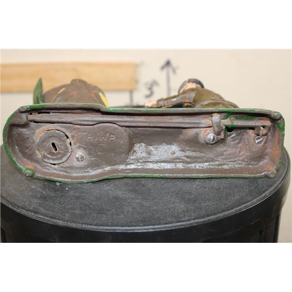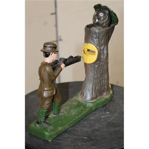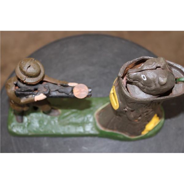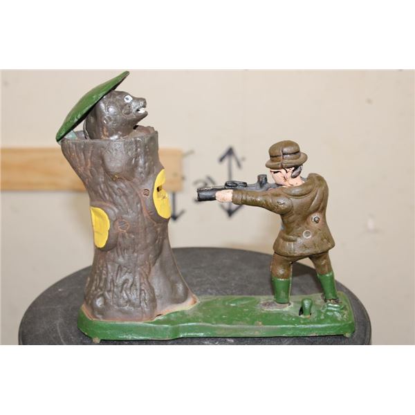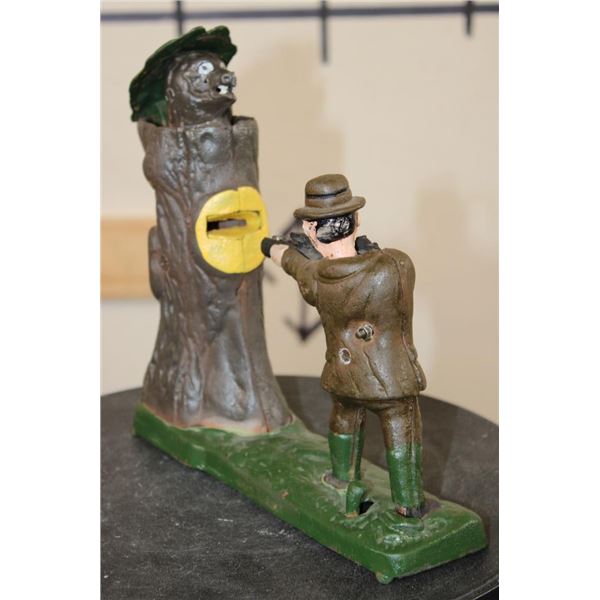 1950's "Teddy and the Bear Bank" (Teddy Roosevelt). It is an early reproduction (Taiwan) Cast Iron mechanical bank. These wonderful action packed penny banks originated in the late 1800?s. They were designed to teach kids that saving was fun. This penny bank is an authentic working reproduction of the original antique. Molds were skillfully made by professional craftsmen and hand cast like the originals. Then the bank was assembled and carefully decorated by hand. It measures approximately 9.75" Long x 3" Wide x 9.5" Tall and Weighs 5 lbs 5 oz. Teddy will shoot the coin into the tree knot but the bear will not spring down into the tree. Seemingly an easy fix with patience. The paint is in good condition and appropriate for age. Requires some patience to get the bear?s head back in the tree. Teddy?s head moves to allow for the recoil of the rifle when a coin is shot into the tree opening. COLLECTIBLE HUNTING BANKS AND CAST IRON TOYS