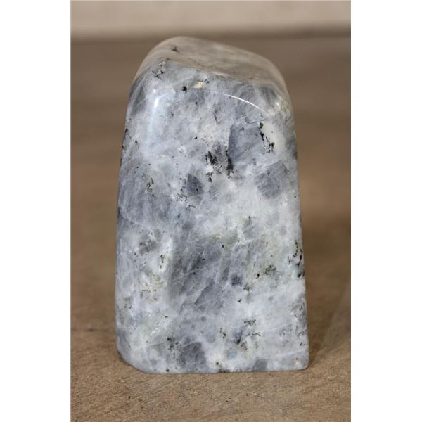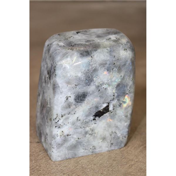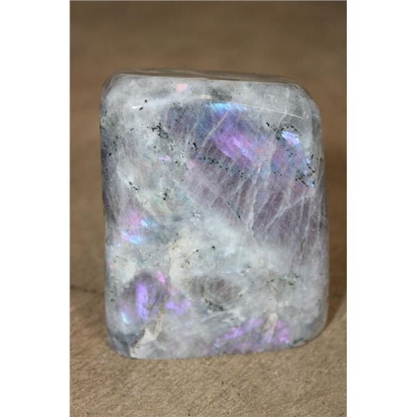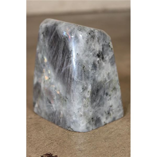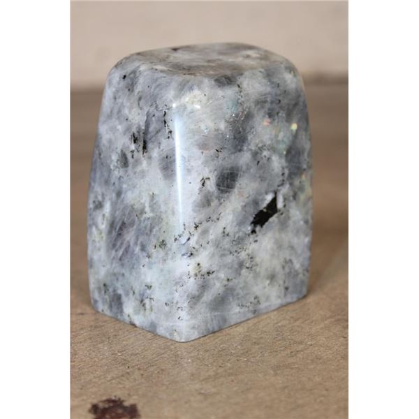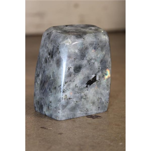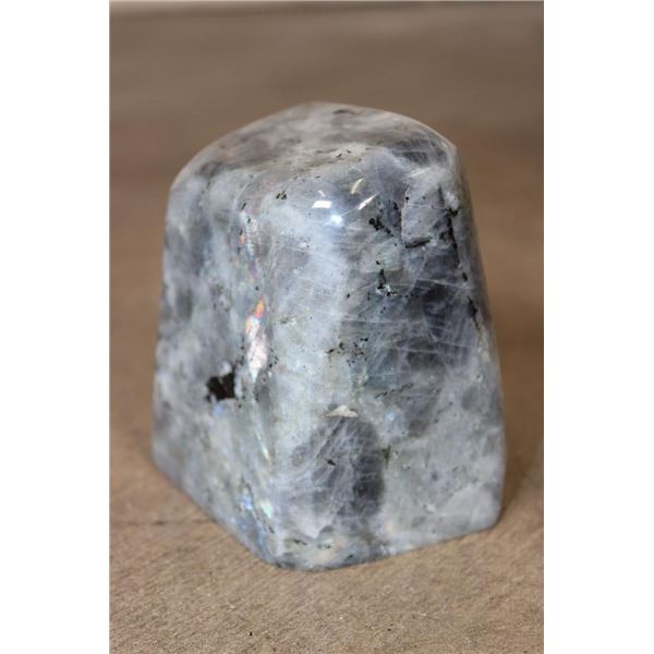 Lovely Formed and Polished LABRADORITE Specimen with a smooth cut base. It has a beautiful shimmering iridescent colorway. 3 lb Total Weight and it measures 4.25" Tall x 3.5" Long x 2.75" Wide. Labradorite displays a unique optical effect called Labradorescence, where light reflects off internal mineral layers, creating iridescent colors. ROCKS MINERALS FOSSILS