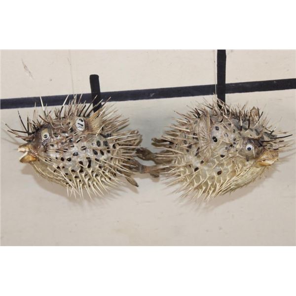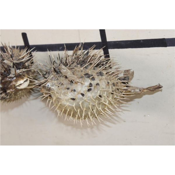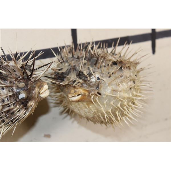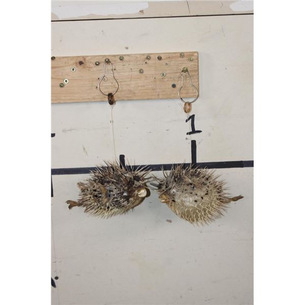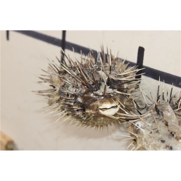 2 BALLOONFISH aka Long-spine PORCUPINE FISH with google eyes and ceiling hangers (ONE$). The Balloonfish is a member of the family Diodontidae, the spiny puffers. This fish along with its close relatives, has the ability to inflate its body by taking water or air into portions of its digestive track, increasing its diameter size as much as 3 times. When the body expands, long spines that normally lie flat on the body are erected, not only adding to the size but also creating a formidable weaponry to discourage attack by predators. (ONE$) TAXIDERMY FISH