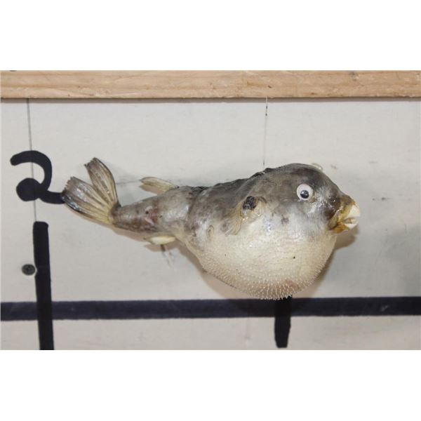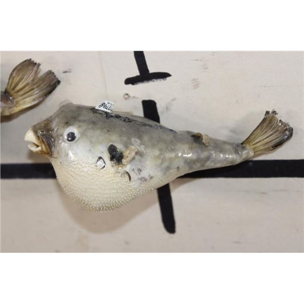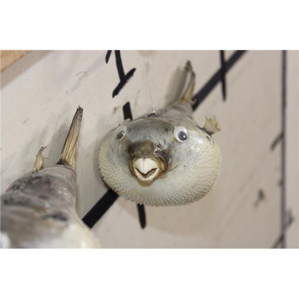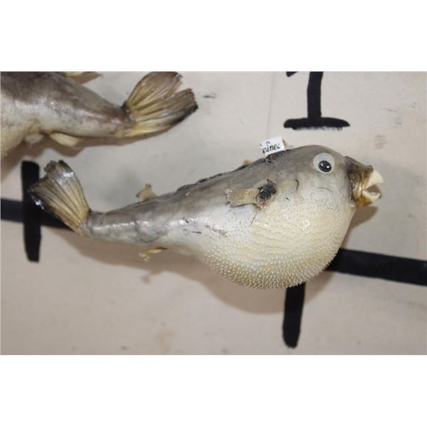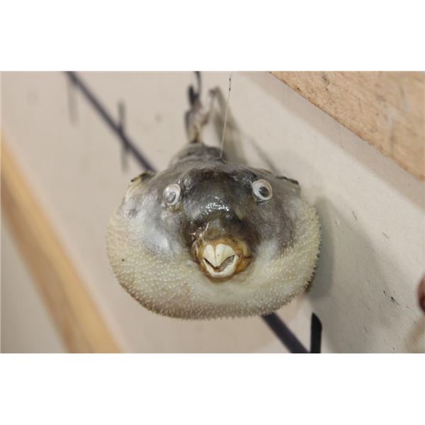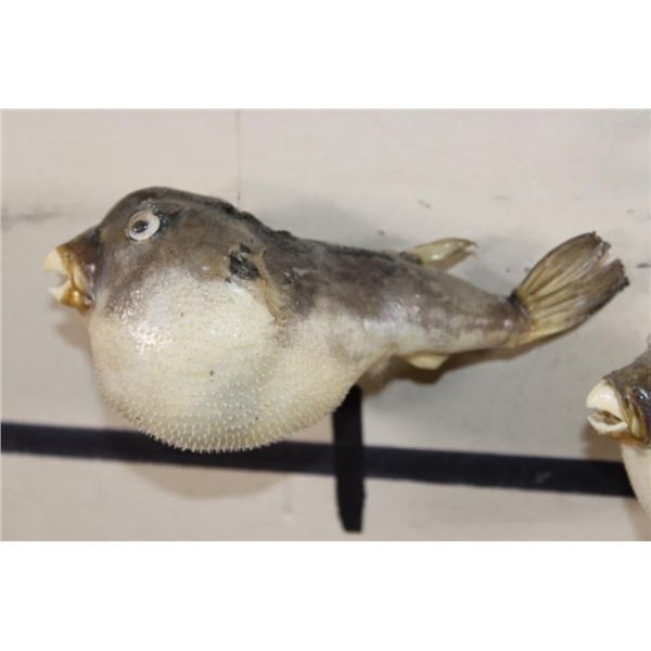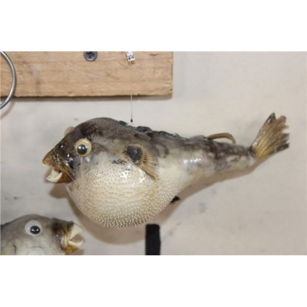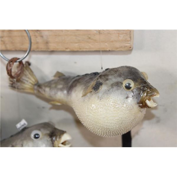 3 BLUNTHEAD PUFFER FISH with Ceiling hangers. These fish have a unique defense mechanism! They can inflate their bodies with water or air to appear larger and deter predators. The lifespan of the Blunthead Puffer can range from 3 to 20 years with an average of around 10 years. (ONE$) TAXIDERMY FISH