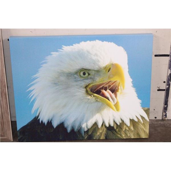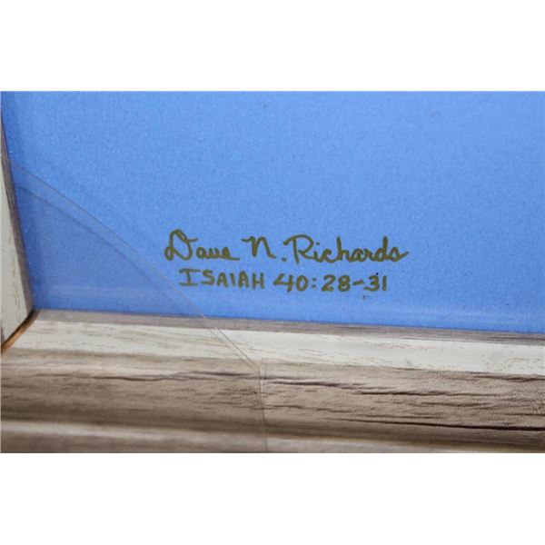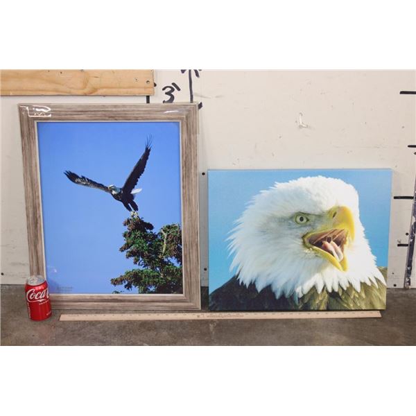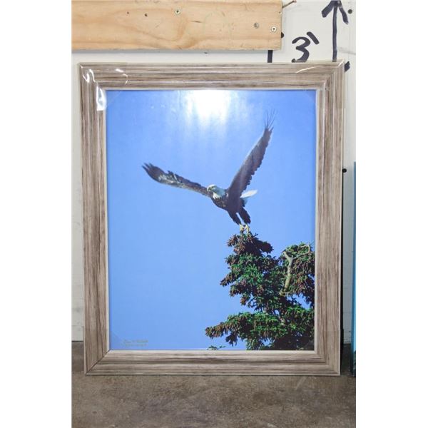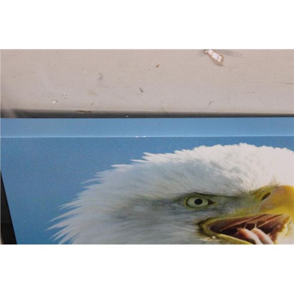 Majestic Framed BALD EAGLE Photo by Dave N. Richards. It has been signed "Dave N. Richards, Isaiah 40:28-31". It is in a wood and glass frame that measures 24" Tall x 19.5" Wide. Also with this lot is a BALD EAGLE Canvas print. It measures 16" Tall x 20" Wide. (ONE$) DECORATIVE WILDLIFE ART PHOTOGRAPHY
