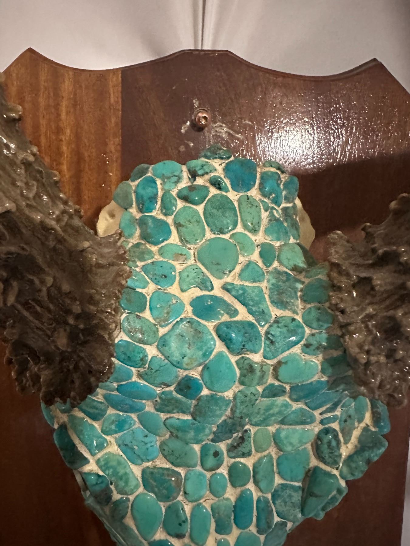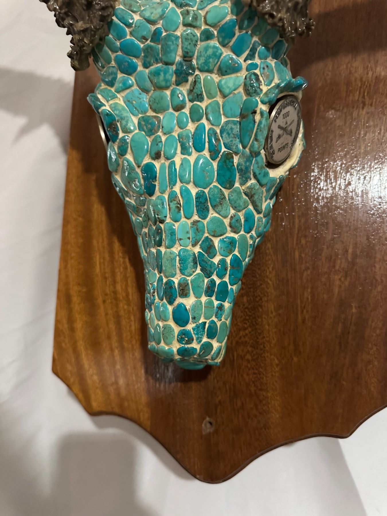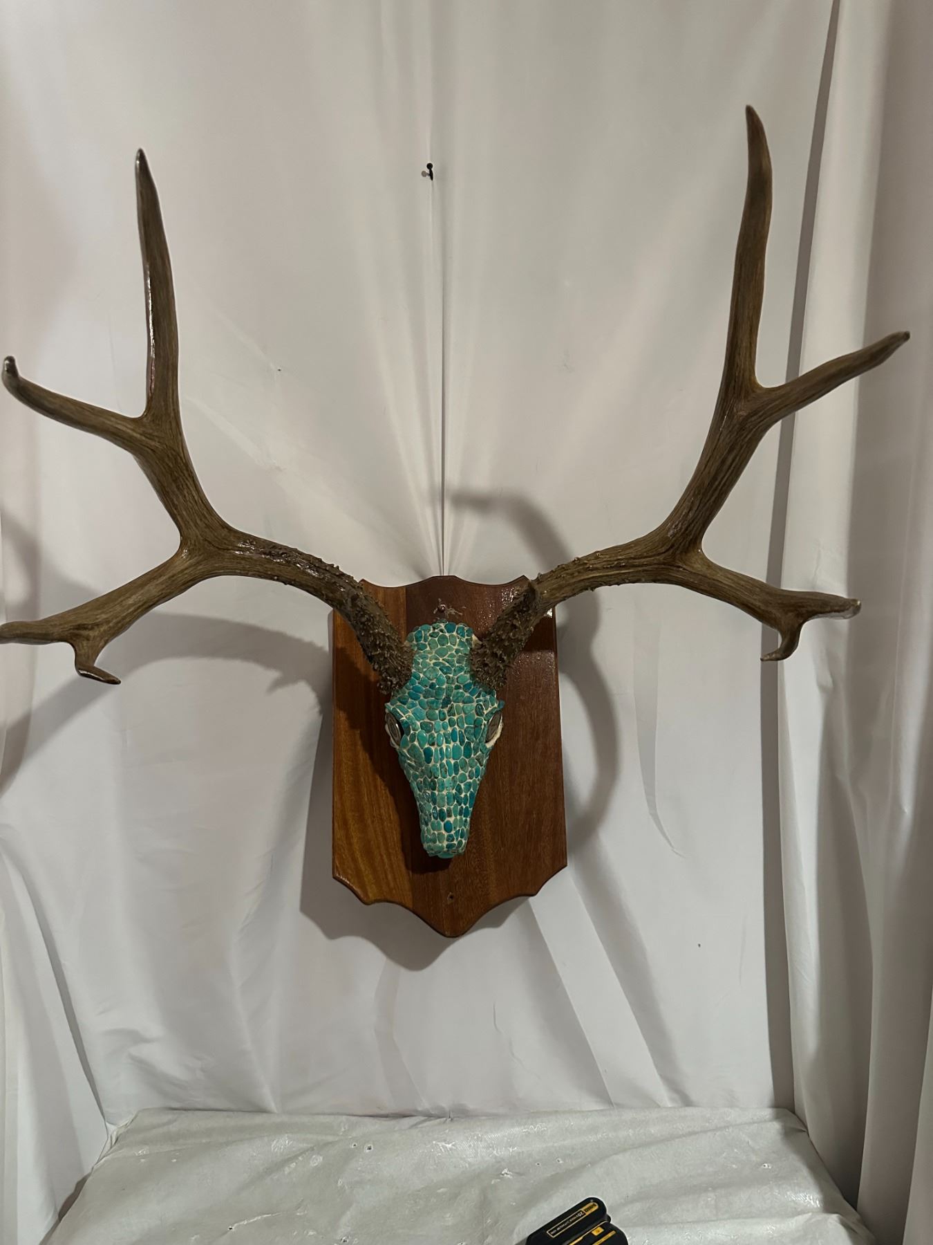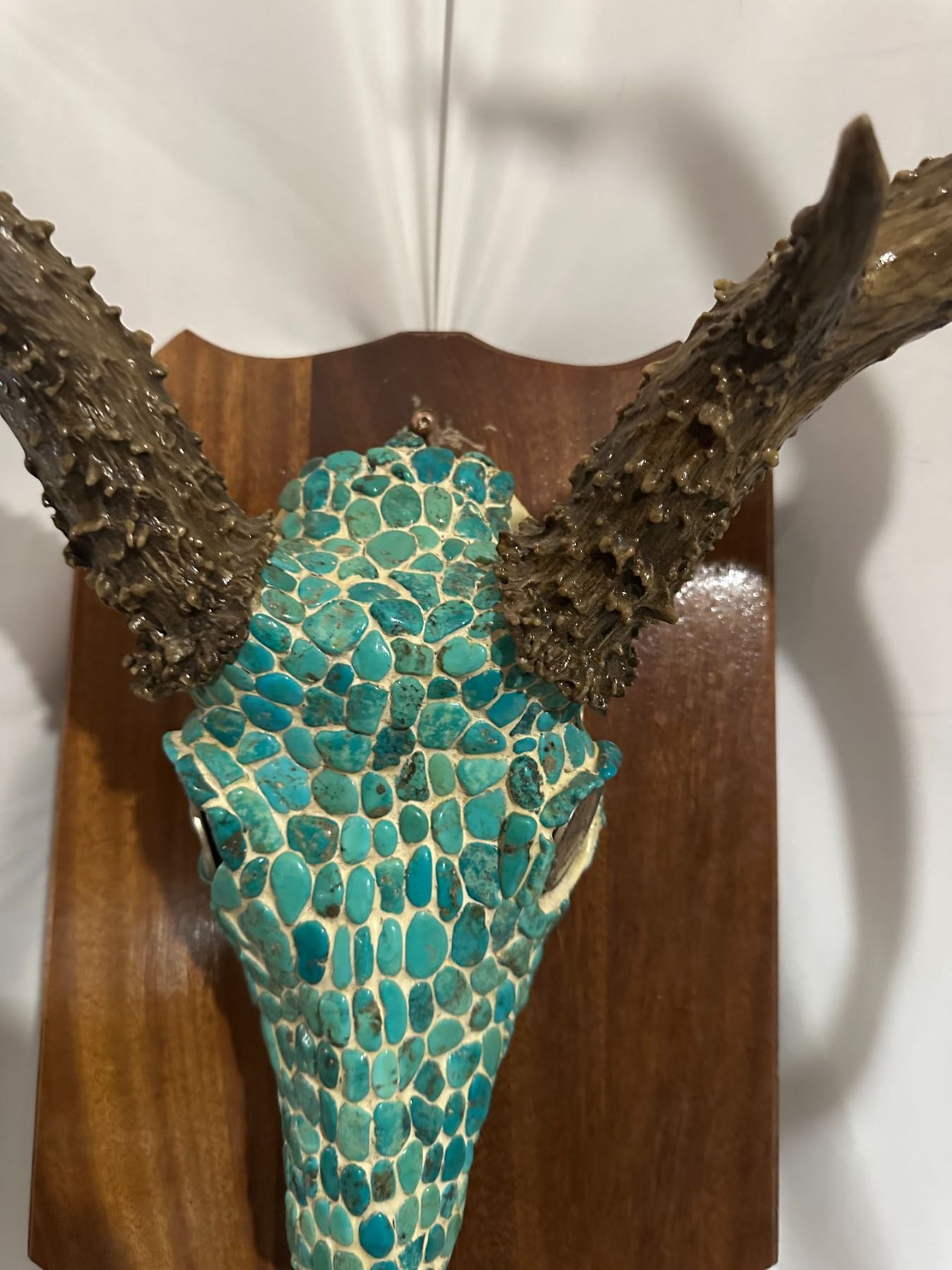The Mule Deer antlers have 4 points on each side with the left antler supporting an eye guard. The outside spread is a 27 ½” and scores in the low 170ies, with taller than average antlers, the piece looks larger than life. The expert inlays of the stones make this piece the perfect addition in any setting, truly a master piece of art work. This piece will stand out in any setting, and will make a great addition to any room. It will be the envy of everyone that gazes upon this masterpiece.