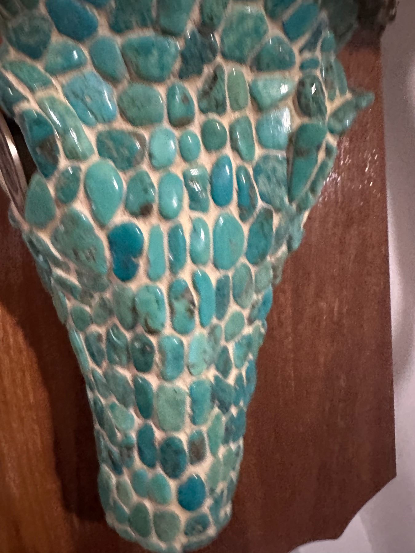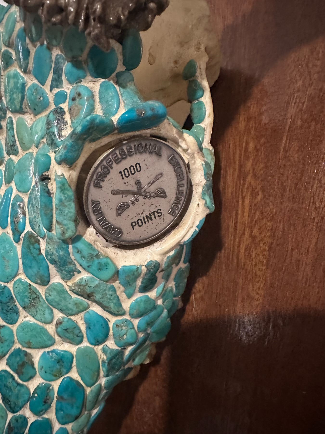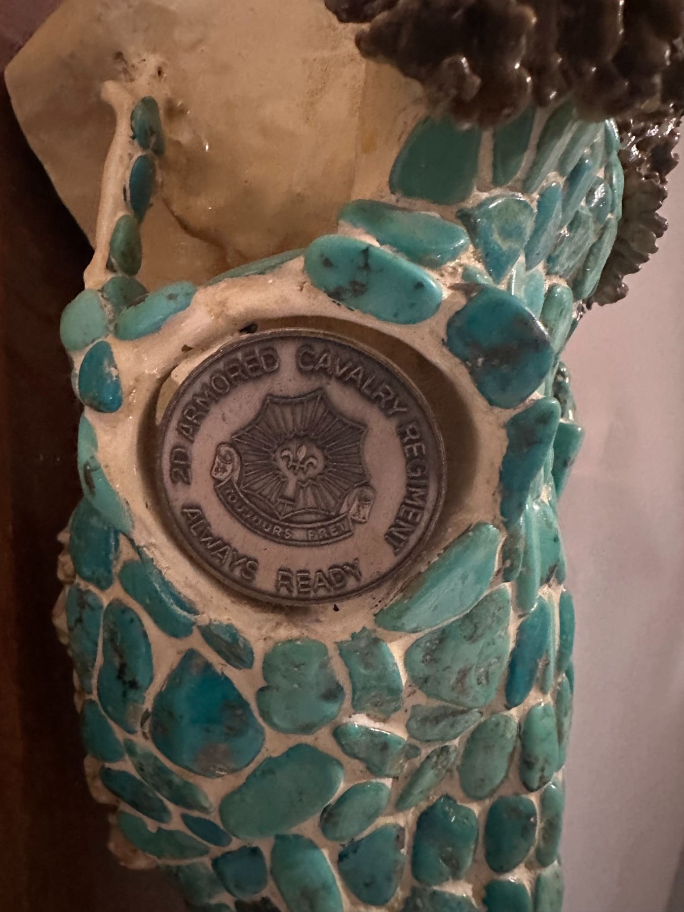 Unique and stunning, this beautifully adorned Mule skull, has been hand crafted and adorned with dozens of Dyed Howlite cut Stones, They look like Turquoise and if you’re not an expert you would not know the difference. In the eye sockets they are two medallions; the left eye’s medallion is from the 2nd ARMORED CALALRY REGEMENT, the right eye’s medallion is the 2nd ARMORED CALVERY FOR EXCELANCE 1000 POINTS.