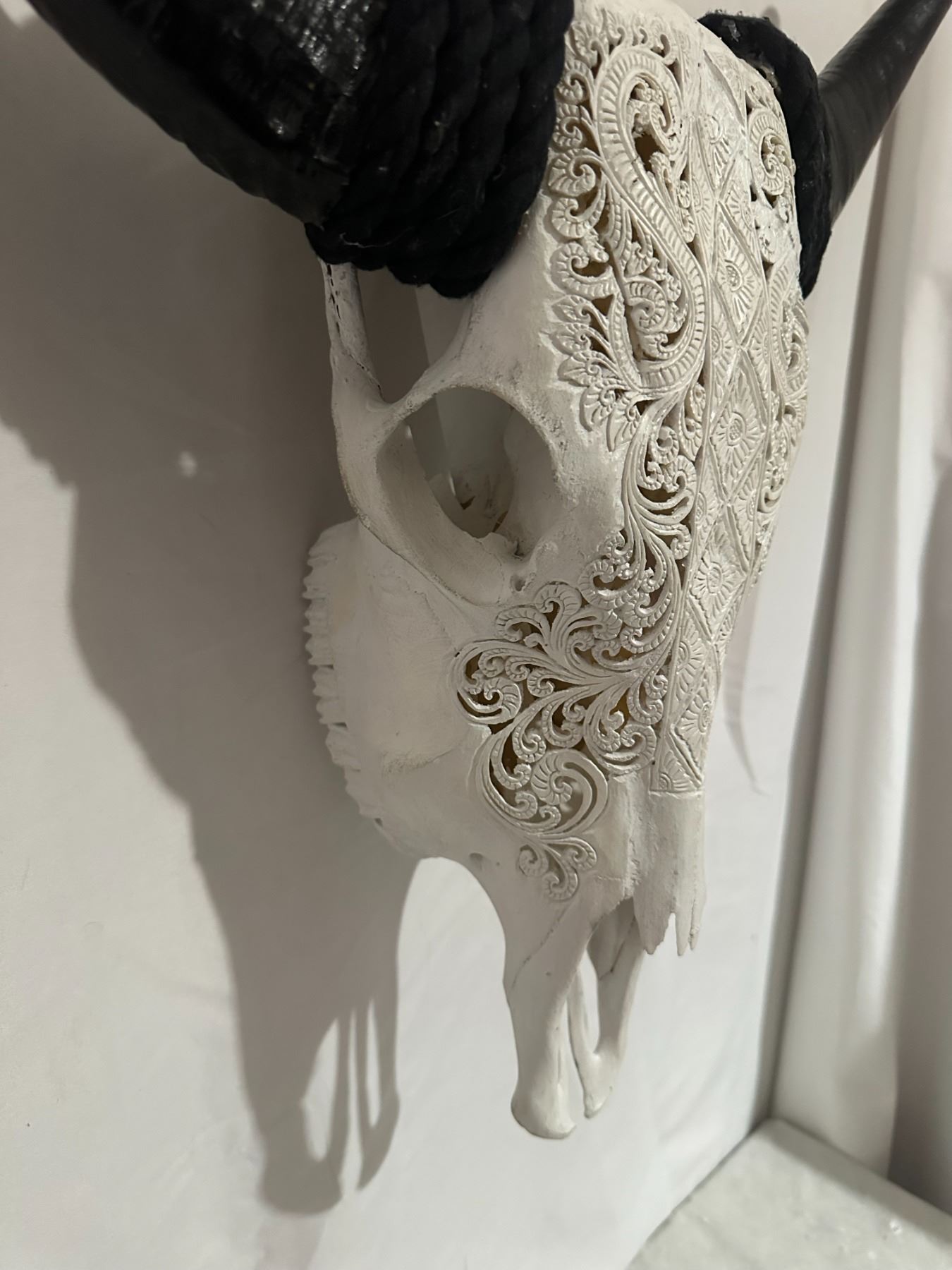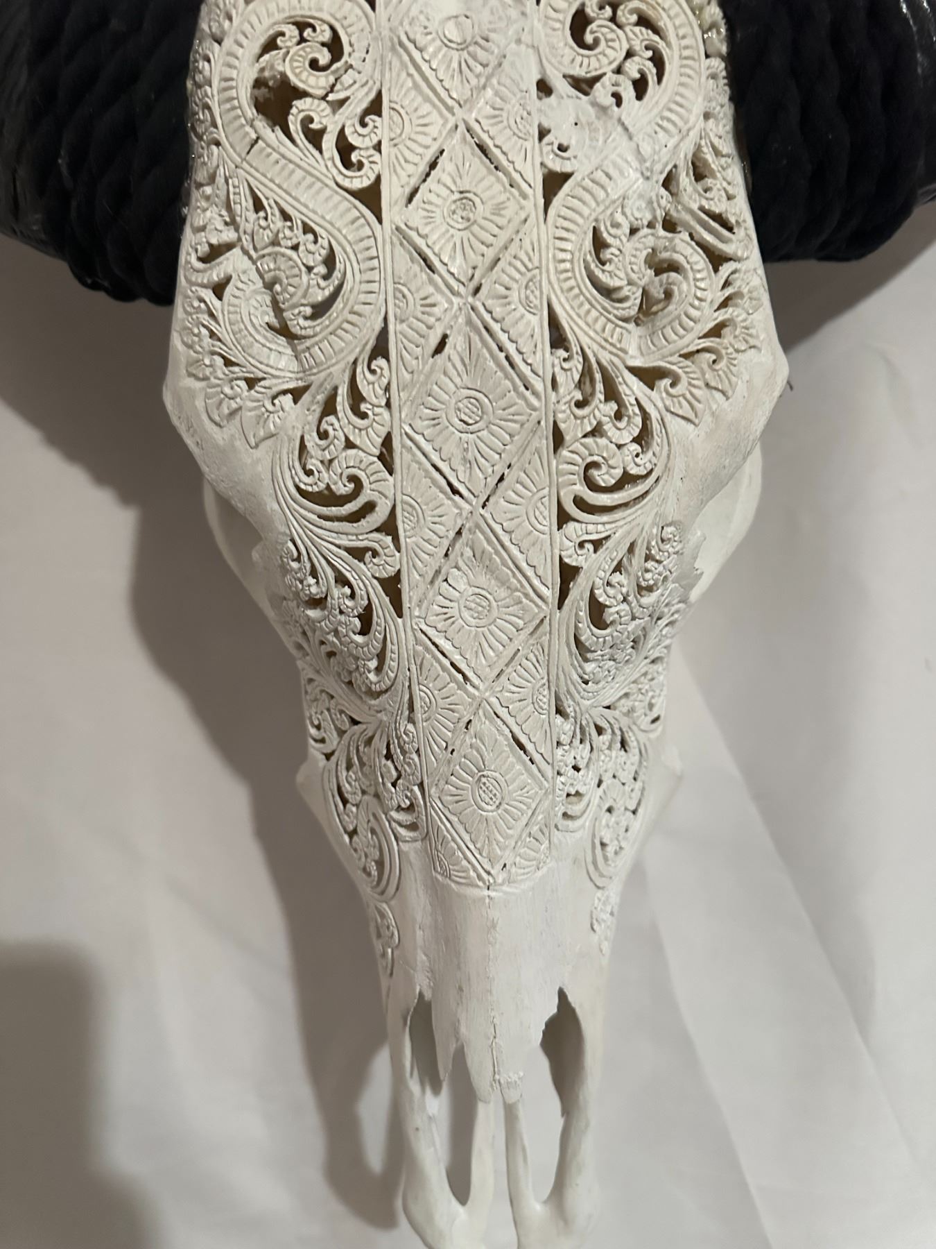 Beautiful authentic hand carved Bison Skull. The perfect piece for any space, the skull is coated with a thin resin to protect the bone.