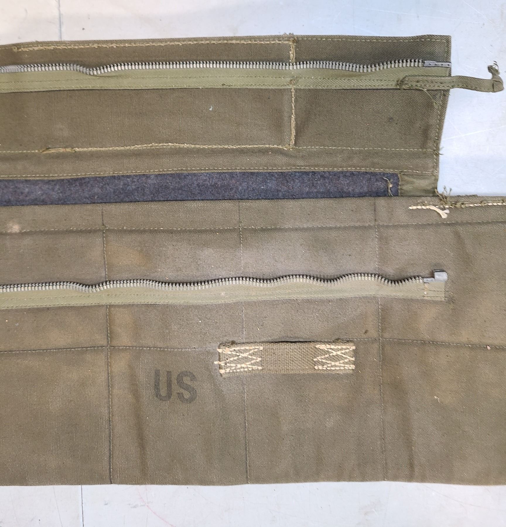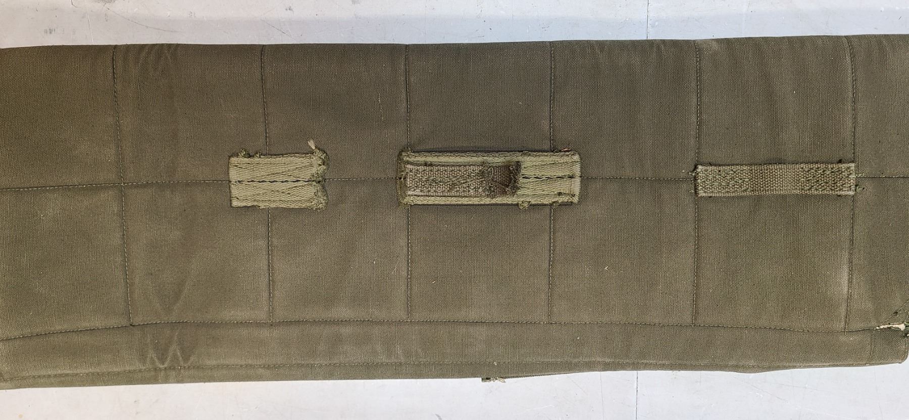 The OD green canvas case shows mild fading, soiling and wear and missing its